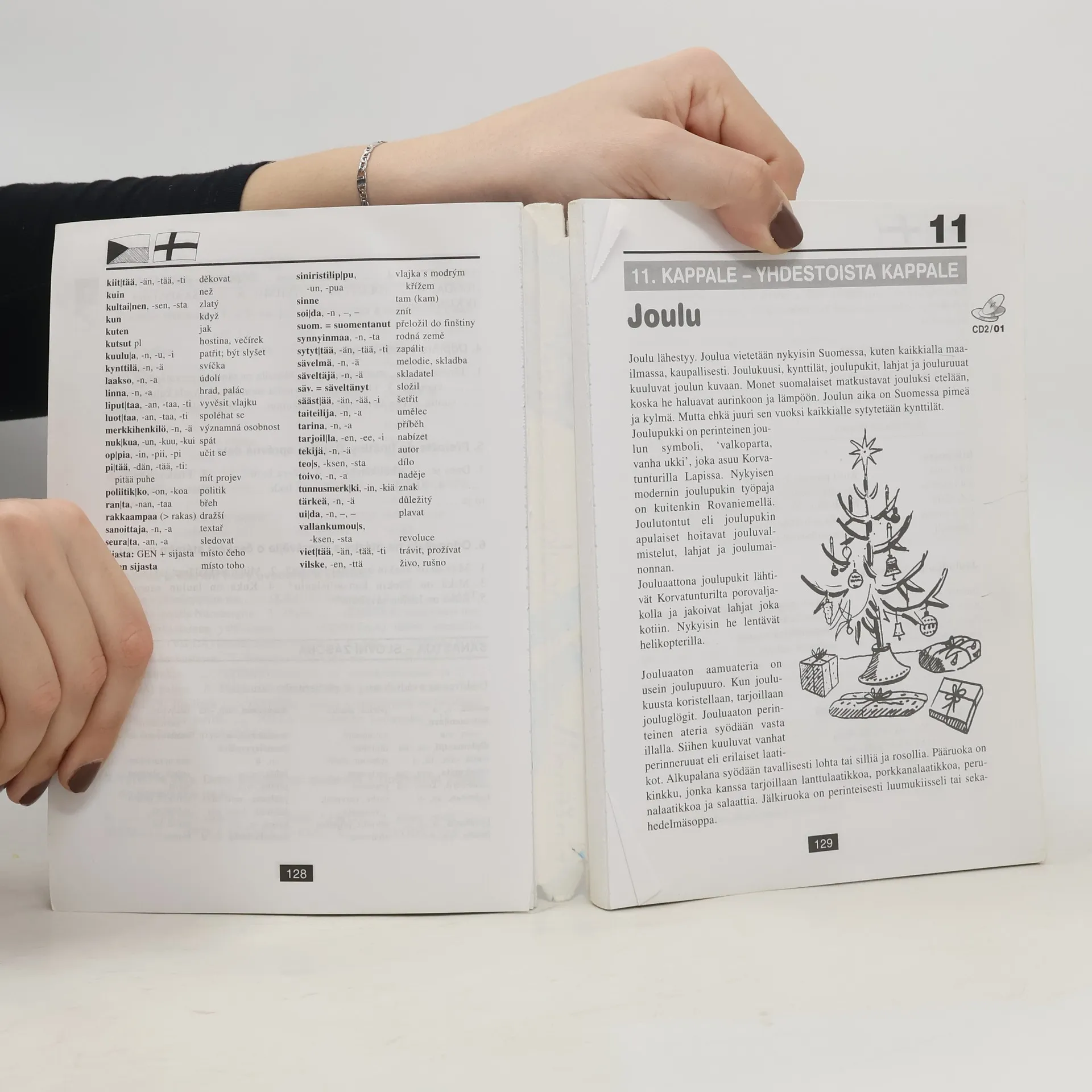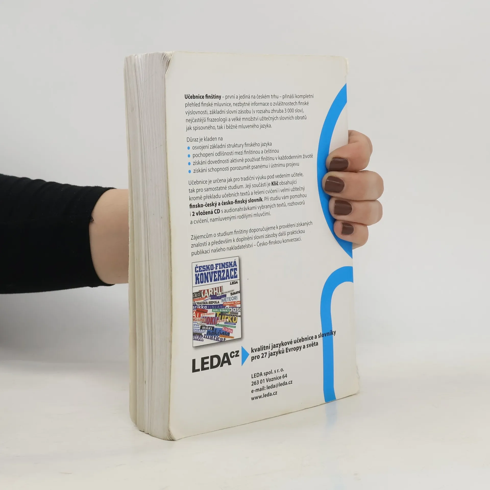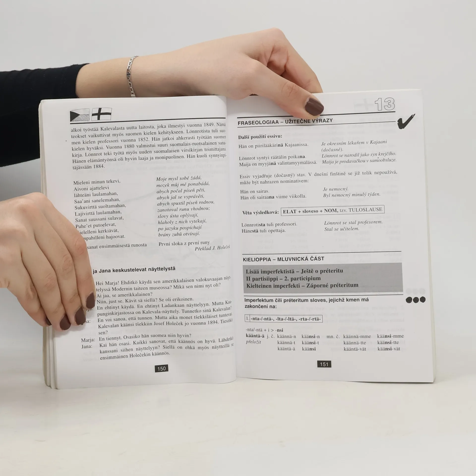 První učebnice finského jazyka pro Čechy nabízí v 31 lekcích úplné základy současné finštiny. Je určena především pro tradiční výuku pod vedením učitele, který může dále doplňovat a rozvádět i to, co – ve snaze pojmout do knihy co nejvíce – mohlo být jen naznačeno nebo zmíněnookrajově. Svým uspořádáním je však tato učebnice vhodná i pro samouky. Součástí učebnice jsou praktický klíč, který kromě překladů učebních textů a rozhovorů z jednotlivých lekcí učebnice a kromě řešení ke cvičením obsahuje i velmi užitečný finsko-český slovník obsahující zhruba 3000 hesel a česko-finský slovník o rozsahu zhruba 1000 hesel, a 2 audio CD.