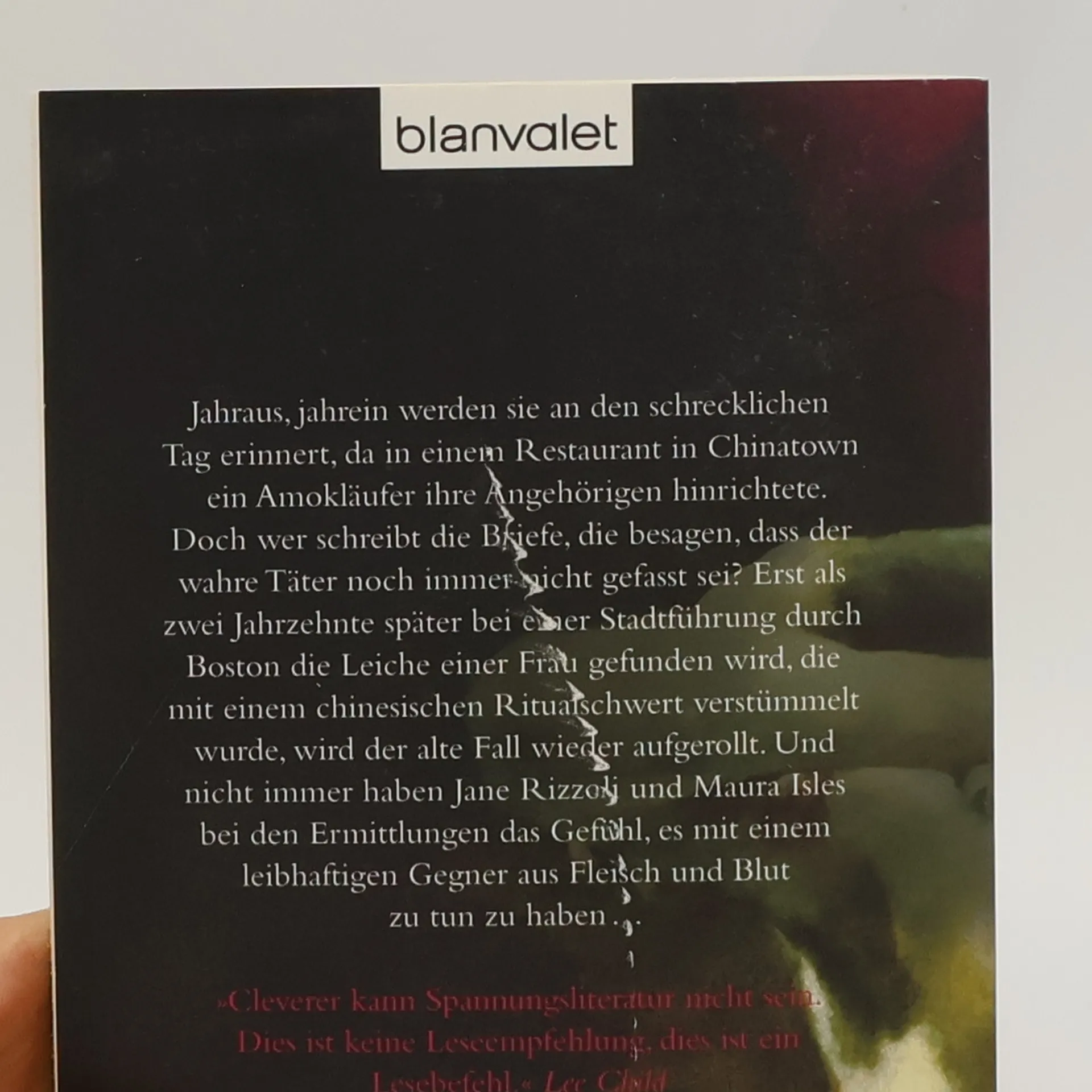 Boston, Chinatown. Eine alte Legende erwacht zum Leben … Jahraus, jahrein werden sie an den schrecklichen Tag erinnert, da in einem Restaurant in Chinatown ein Amokläufer ihre Angehörigen hinrichtete. Doch wer schreibt die Briefe, die besagen, dass der wahre Täter noch immer nicht gefasst sei? Erst als zwei Jahrzehnte später bei einer Stadtführung durch Boston die Leiche einer Frau gefunden wird, die mit einem chinesischen Ritualschwert verstümmelt wurde, wird der alte Fall wieder aufgerollt. Und nicht immer haben Jane Rizzoli und Maura Isles bei den Ermittlungen das Gefühl, es mit einem leibhaftigen Gegner aus Fleisch und Blut zu tun zu haben …