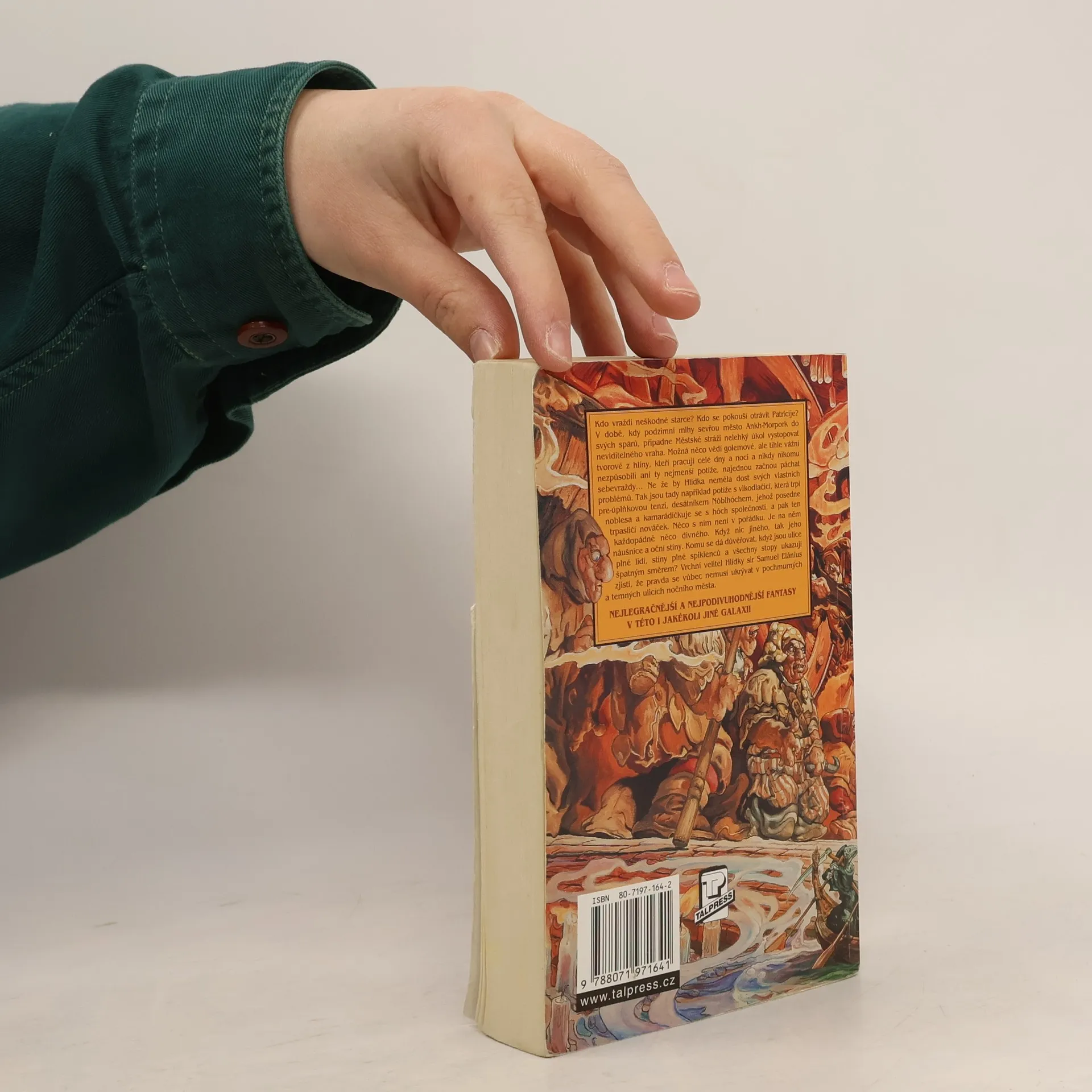 Kdo vraždí neškodné starce? Kdo se pokouší otrávit Patricije? V době, kdy podzimní mlhy sevřou město Ankh-Morpork do svých spárů, připadne Městské stráži nelehký úkol vystopovat neviditelného vraha. Možná, že něco vědí golemové, ale tihle vážní tvorové z hlíny, kteří pracují celé dny a noci a nikdy nikomu nezpůsobili ani ty nejmenší potíže, najednou začnou páchat sebevraždy. Ne že by Hlídka neměla dost svých vlastních problémů. Tak jsou tady například potíže s vlkodlačicí, která trpí pre-úplňkovou tenzí, desátníkem Nóblhóchem, jehož posedne noblesa a kamarádíčkuje se s hóch společností, a pak ten trpasličí nováček. Něco s ním není v pořádku. Je na něm každopádně něco divného. Když nic jiného, tak jeho náušnice a oční stíny. Komu se dá důvěřovat, když jsou ulice plné lidí, stíny plné spiklenců a všechny stopy ukazují špatným směrem? Vrchní velitel Hlídky sir Samuel Elánius zjistí, že pravda se vůbec nemusí ukrývat v pochmurných a temných ulicích nočního města. Úžasná Zeměplocha, kniha 20., přeložil Jan Kantůrek.