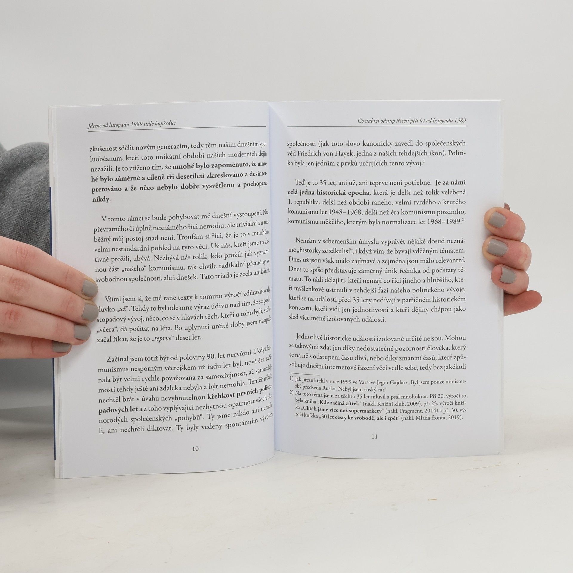 Každé kulaté výročí nejvýznamnější události našich moderních dějin, 17. listopadu 1989, inspiruje mnohé k zamyšlení a k nahlédnutí této události zase o něco pozměněným pohledem. Bývalý prezident České republiky Václav Klaus, po svých knihách ke kulatým výročím listopadu z let 2009, 2014 a 2019, přichází po pěti letech s novým esejem, tentokrát již k pětatřicátému výročí. Nejde mu o historické detaily a dějepis, i když i ty jsou podstatné, protože mnozí již leccos zapomněli a jiní to už nevědí. Bývalého českého prezidenta a jednu z klíčových osobností polistopadových změn zajímá dnešek. Na něj nahlíží prostřednictvím tehdejších událostí a pozitivních změn, které rok 1989 umožnil a byly v naší zemi následně provedeny. Základní myšlenkou výročního textu je teze, že naše polistopadová cesta vpřed se poněkud zadrhla. Václav Klaus tak svým esejem hledá odpověď na otázku, zda jdeme od listopadu 1989 ještě stále kupředu, anebo už nikoli?