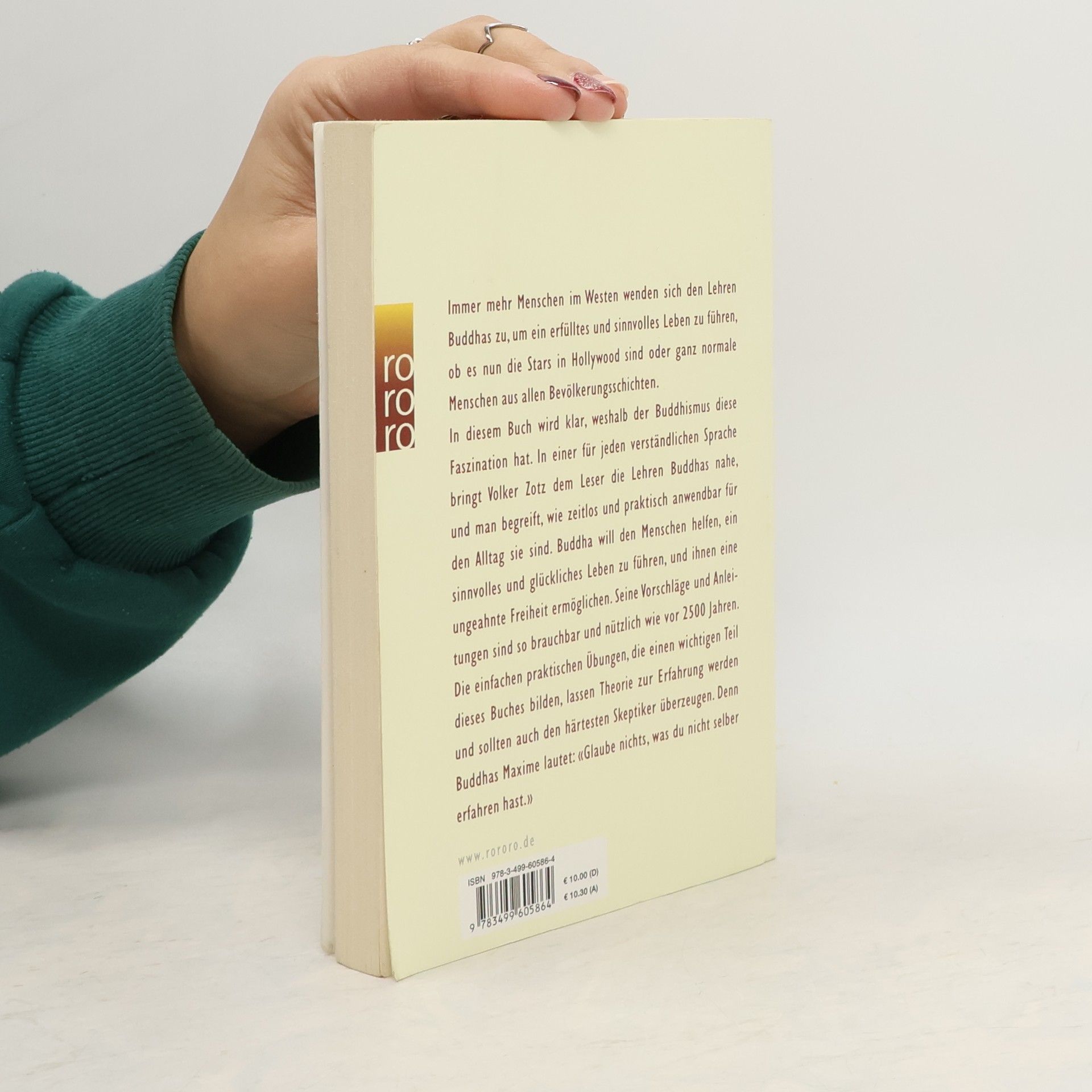 Immer mehr Menschen im Westen wenden sich den Lehren Buddhas zu, um ein erfülltes und sinnvolles Leben zu führen, ob es nun die Stars in Hollywood sind oder ganz normale Menschen aus allen Bevölkerungsschichten.In diesem Buch wird klar, weshalb der Buddhismus diese Faszination hat. In einer für jeden verständlichen Sprache bringt Volker Zotz dem Leser die Lehren Buddhas nahe, und man begreift, wie zeitlos und praktisch anwendbar für den Alltag sie sind. Buddha will den Menschen helfen, ein sinnvolles und glückliches Leben zu führen, und ihnen eine ungeahnte Freiheit ermöglichen. Seine Vorschläge und Anleitungen sind so brauchbar und nützlich wie vor 2500 Jahren. Die einfachen praktischen Übungen, die einen wichtigen Teil dieses Buches bilden, lassen Theorie zur Erfahrung werden und sollten auch den härtesten Skeptiker überzeugen. Denn Buddhas Maxime lautet: «Glaube nichts, was du nicht selber erfahren hast.»