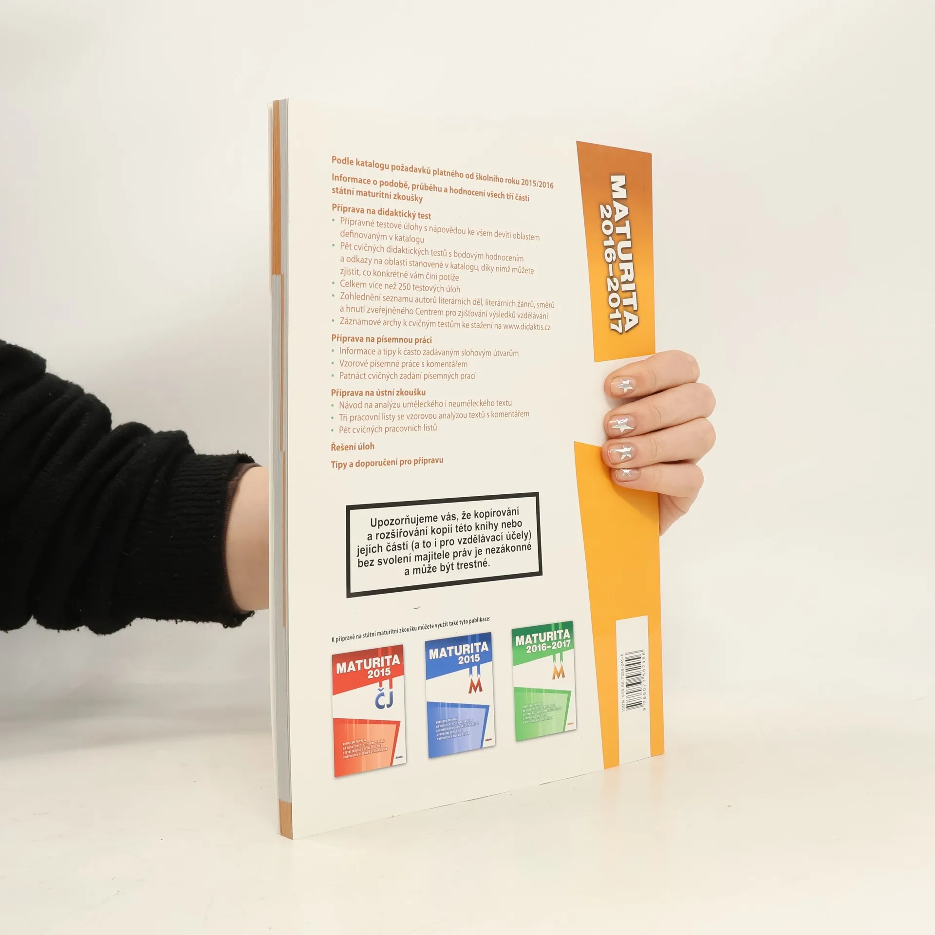 Komplexní cílená příprava na maturitní zkoušku z českého jazyka a literatury, poskytující metodická doporučení ke všem třem jejím částem. Zohledňuje aktuálně platný katalog požadavků i seznam autorů literárních děl, literárních žánrů, směrů a hnutí zveřejněného Centrem pro zjišťování výsledků vzdělávání. Poskytuje základní informace, tipy a doporučení ke státní maturitní zkoušce. Strukturou navazuje na příručku Maturita 2015 z českého jazyka a literatury, obsahuje však zcela nové úlohy. Nabízí čtyřfázový nácvik na všechny části státní maturity (didaktický test, písemnou práci, ústní zkoušku): informace, tréninkovou část, vlastní úlohy, zpětnou vazbu