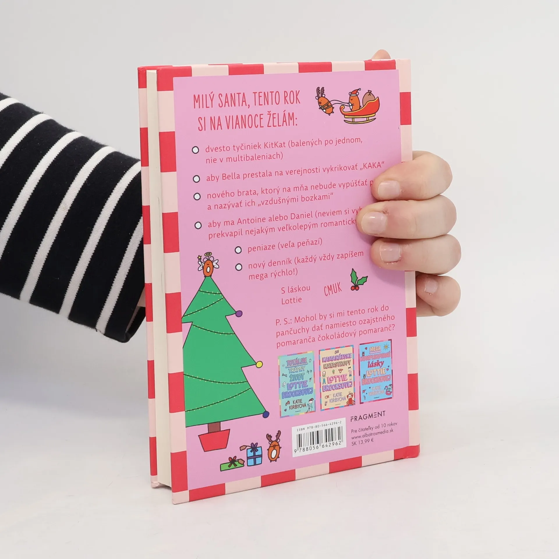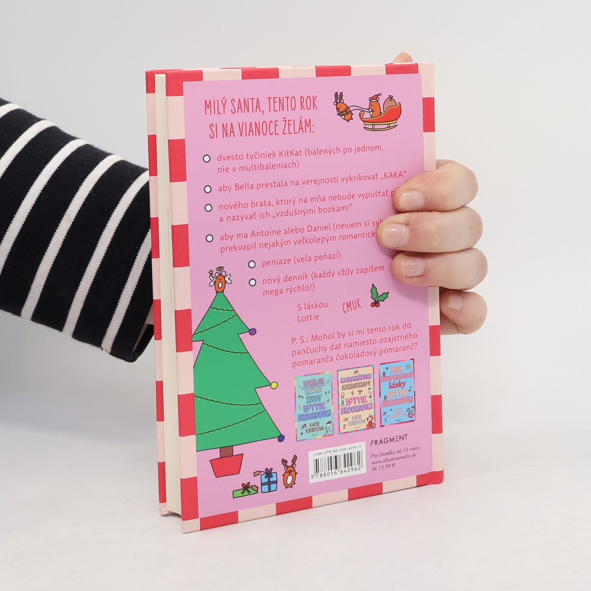 Moriačia maska, trblietavé hovienko, zmasakrovaný vianočný škriatok... ALE nakoniec dopadne všetko (celkom) dobre MILÝ SANTA, tento rok si na Vianoce želám: - dvesto tyčiniek KitKat (balených po jednom, nie v multibaleniach) - aby Bella prestala na verejnosti vykrikovať „KAKA“ - nového brata, ktorý na mňa nebude vypúšťať prdy a nazývať ich „vzdušnými bozkami“ - aby ma Antoine alebo Daniel (neviem si vybrať) prekvapil nejakým veľkolepým romantickým gestom - peniaze (veľa peňazí) - nový denník (každý vždy zapíšem mega rýchlo!) S láskou, Lottie Cmuk P. S.: Mohol by si mi tento rok do pančuchy dať namiesto ozajstného pomaranča čokoládový pomaranč?
