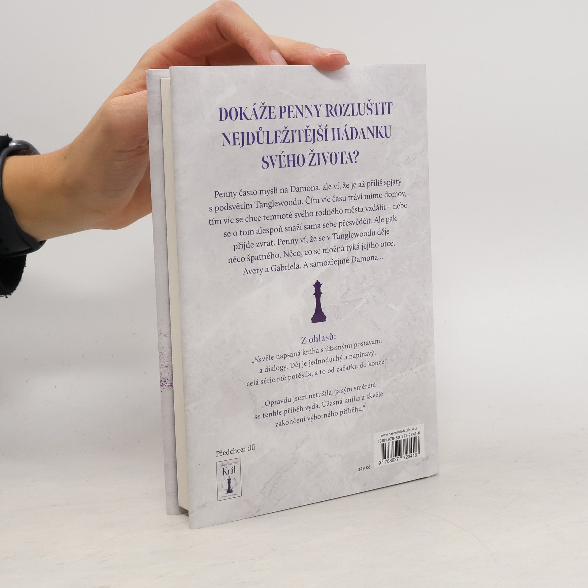 Mám jen jedinou šanci začít nový život. Studovat vysokou školu. Mít budoucnost za temnými zdmi Tanglewoodu. Na jeden dechberoucí okamžik jsem si myslela, že se mi podaří uniknout. A pak přišel ten telefonát. Damon Scott je můj osobní drak, boj, který vždycky prohraju, tajná naděje v mém srdci. A potřebuje, abych mu pomohla. Hned. Jen já dokážu najít odpověď na hádanku. Jen moje přítomnost může zachránit jeho zdravý rozum, když je proti němu celé město. Jen moje srdce by mohlo odemknout srdce muže s tak tragickou minulostí. Tohle je moje poslední hra a v sázce je úplně všechno. Úplně poslední hra, ve které můžu vyhrát budoucnost pro nás oba. A taky lásku, dost silnou na to, aby roztříštila celé město. Královna je druhý díl z duetu Masterpiece o hře na lež a loajalitu, zradu a moc a o vzestupu na trůn města.
