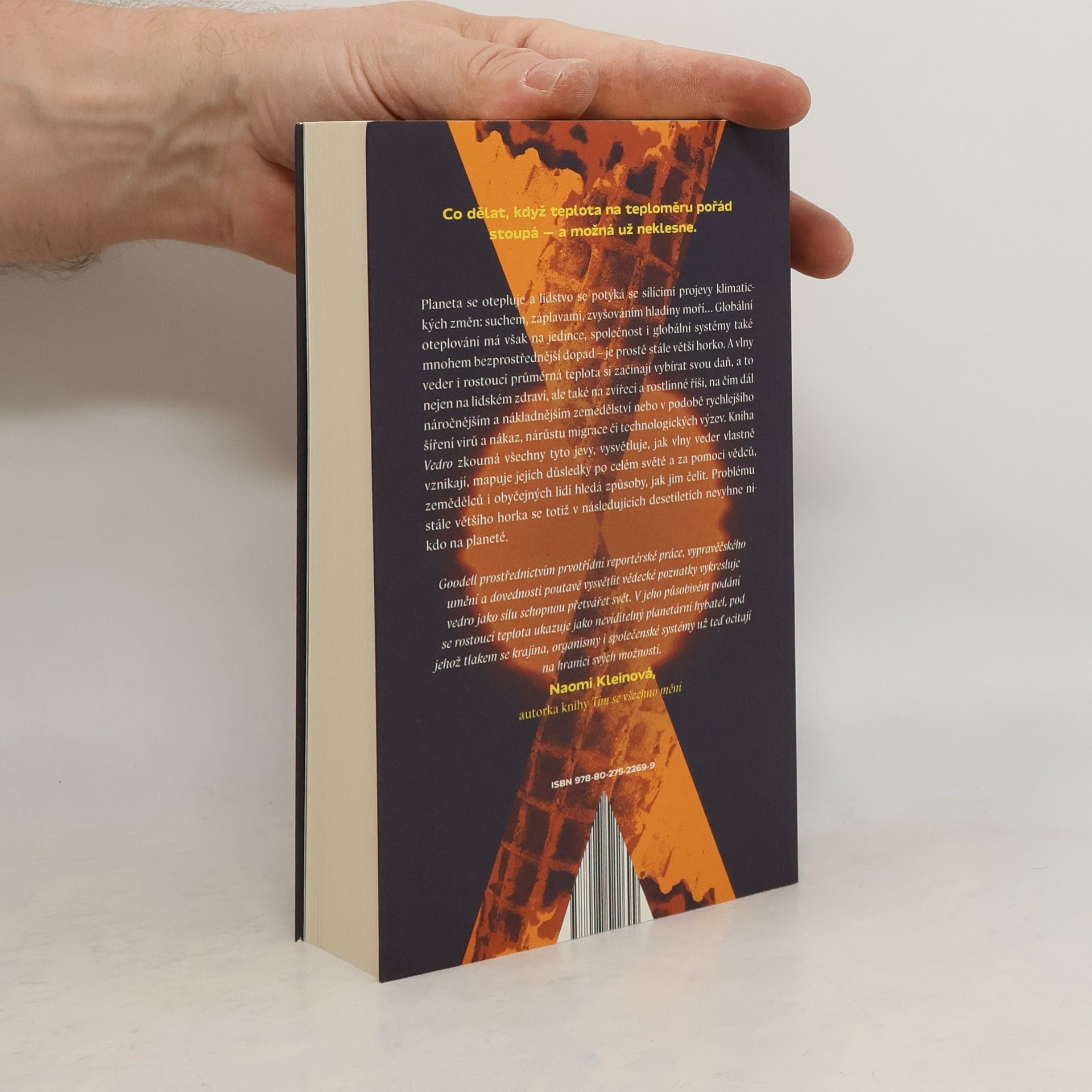 Co dělat, když teplota na teploměru pořád stoupá — a možná už neklesne. Planeta se otepluje a lidstvo musí řešit vršící se dopady klimatické změny: sucho, záplavy, stoupající hladiny moří… Globální oteplování má však i mnohem přímočařejší dopady na jedince, společnost i globální systémy — je prostě stále většíhorko. A vlny veder i rostoucí průměrná teplota si začínají vybírat svou daň: nejen na lidském zdraví, ale také na tom zvířecím, na čím dál náročnějším a nákladnějším zemědělství, v rychlejším šíření virů a nákaz, ve větším počtu migrantů či v technologických výzvách. Kniha Vedro zkoumá všechny tyto jevy, vysvětluje, jak různé vlny veder vlastně vznikají, mapuje jejich dopady po celém světě a za pomoci vědců, zemědělců i obyčejných lidí hledá cesty, jak jim čelit. Problému stoupajícího horka se totiž v následujících desetiletích nevyhne nikdo na planetě.