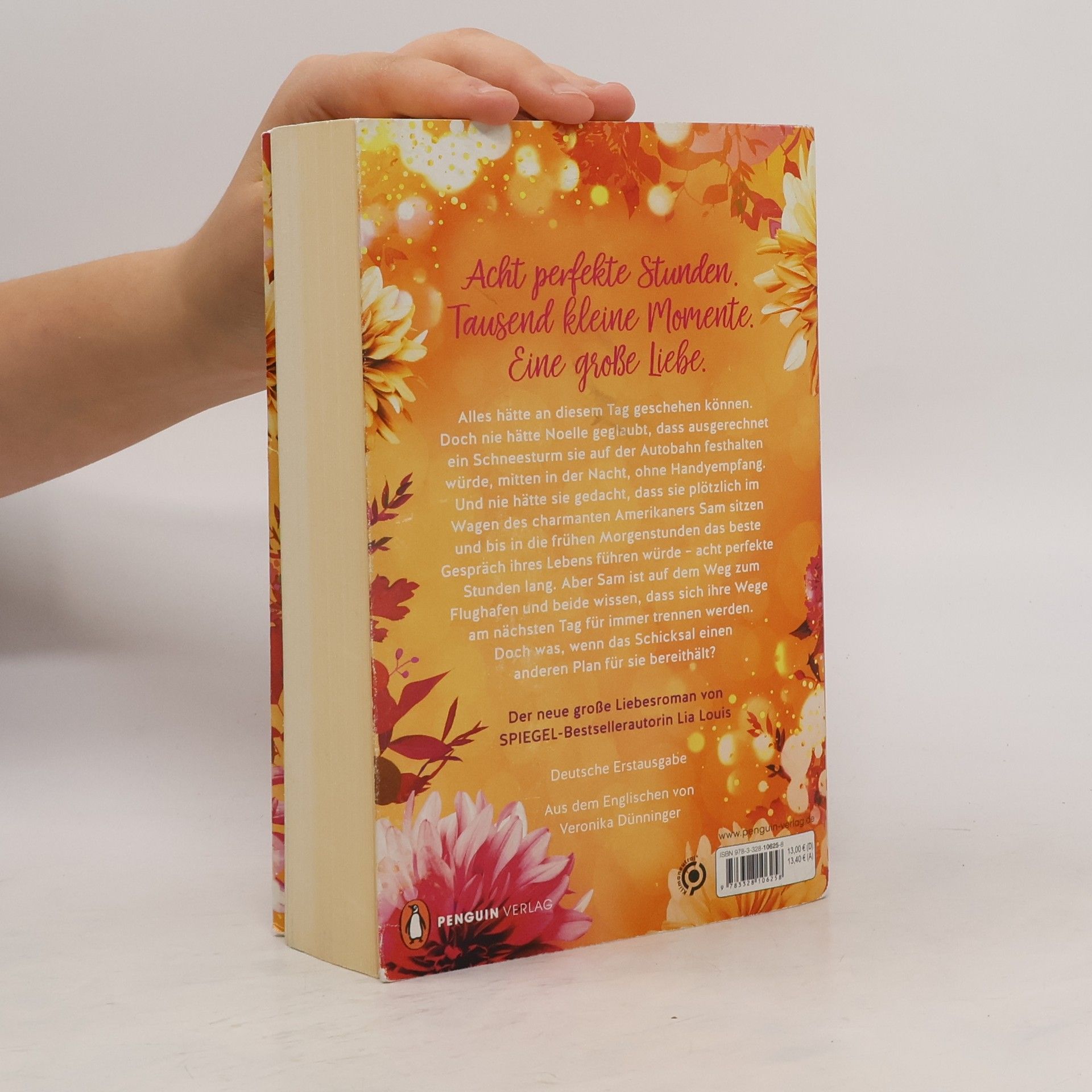 Acht perfekte Stunden. Tausend kleine Momente. Eine große Liebe. Alles hätte an diesem Tag geschehen können. Doch nie hätte Noelle geglaubt, dass ausgerechnet an diesem Tag ein Schneesturm sie auf der Autobahn festhalten würde – mitten in der Nacht, ohne Handyempfang. Und nie hätte sie gedacht, dass sie plötzlich im Wagen des charmanten Amerikaners Sam sitzen und bis in die frühen Morgenstunden das beste Gespräch ihres Lebens führen würde – acht perfekte Stunden lang. Aber Sam ist auf dem Weg zum Flughafen und beide wissen, dass sich ihre Wege am nächsten Tag für immer trennen werden. Doch was, wenn das Schicksal einen anderen Plan für sie bereithält? Der romantische zweite Roman der SPIEGEL-Bestsellerautorin in Sonderausstattung: Funkelndes Perlmuttpapier lässt das Buch in goldenem Glanz erstrahlen Gleich weiterlesen: >>> Entdecken Sie auch Lia Louis' romantischen Bestseller »Jedes Jahr im Juni«. >>> Und in Kürze erhältlich, der große neue Roman der Bestsellerautorin: »Unser Lied für immer«.