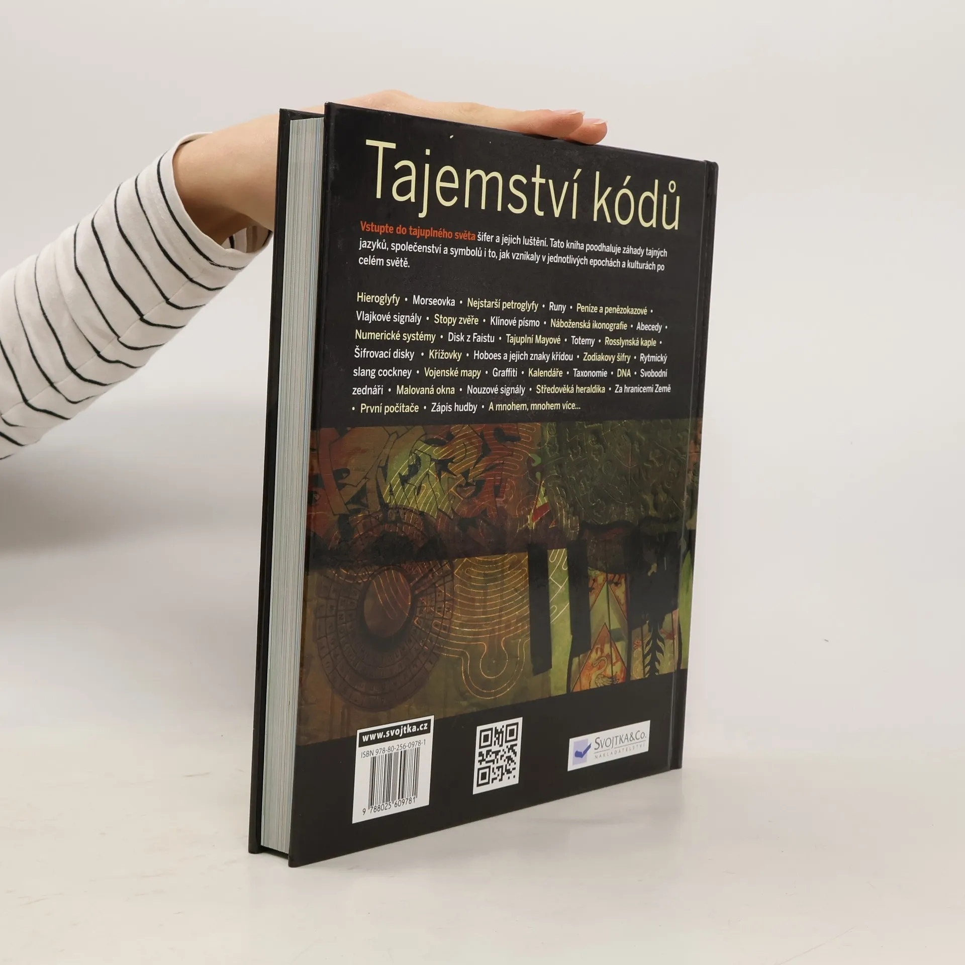 Výpravná obrazová publikace věnovaná dějinám a různým způsobům kódování či symbolického vyjádření informací. Bohatě ilustrovaná knížka nabízí přehled toho, jak se kódy nejrůznějšího druhu používaly k vyjádření širokého spektra informací v různých kulturách světa - od prvního písma po kódování v digitálním věku. Kapitoly představují kódy a šifry určitých typů podle ucelených skupin a témat, např. první kódy (znaková komunikace v přírodě, petroglyfy, nejstarší písma), symboly tajných společenství, vojenské šifry, kódy lidského chování, vizuální kódy, tajná řeč podsvětí, ale i způsoby symbolického zobrazování specifických informací (popis času, schematický popis světa a krajiny, genetické kódy apod.).