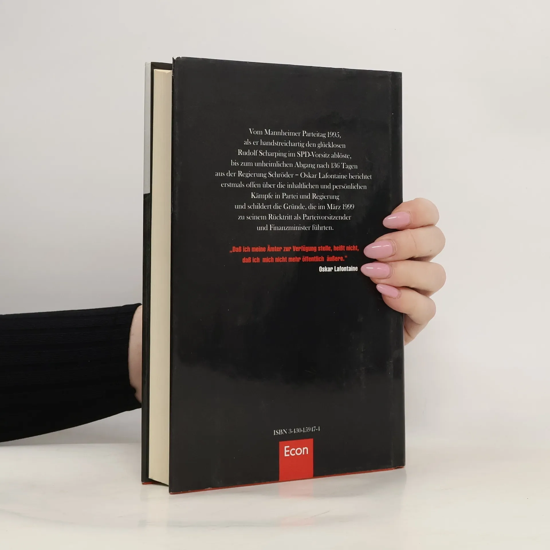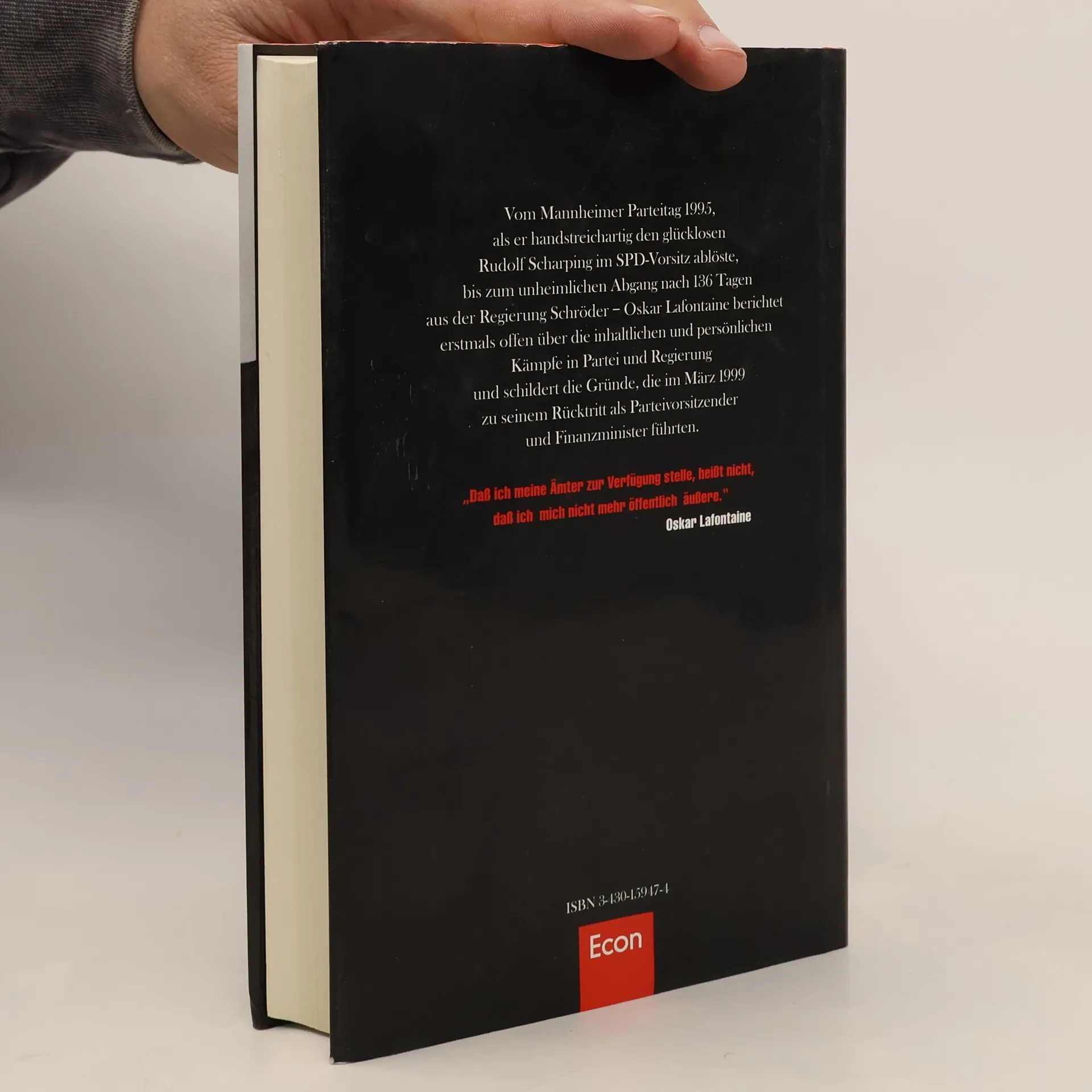 Vom Mannheimer Parteitag 1995, als er handstreichartig den glücklosen Rudolf Scharping im SPD-Vorsitz ablöste, bis zum unheimlichen Abgang nach 136 Tagen aus der Regierung Schröder - Oskar Lafontaine berichtet erstmals offen über die inhaltlichen und persönlichen Kämpfe in Partei und Regierung und schildert die Gründe, die im März 1999 zu seinem Rücktritt als Parteivorsitzender und Finanzminister führten.