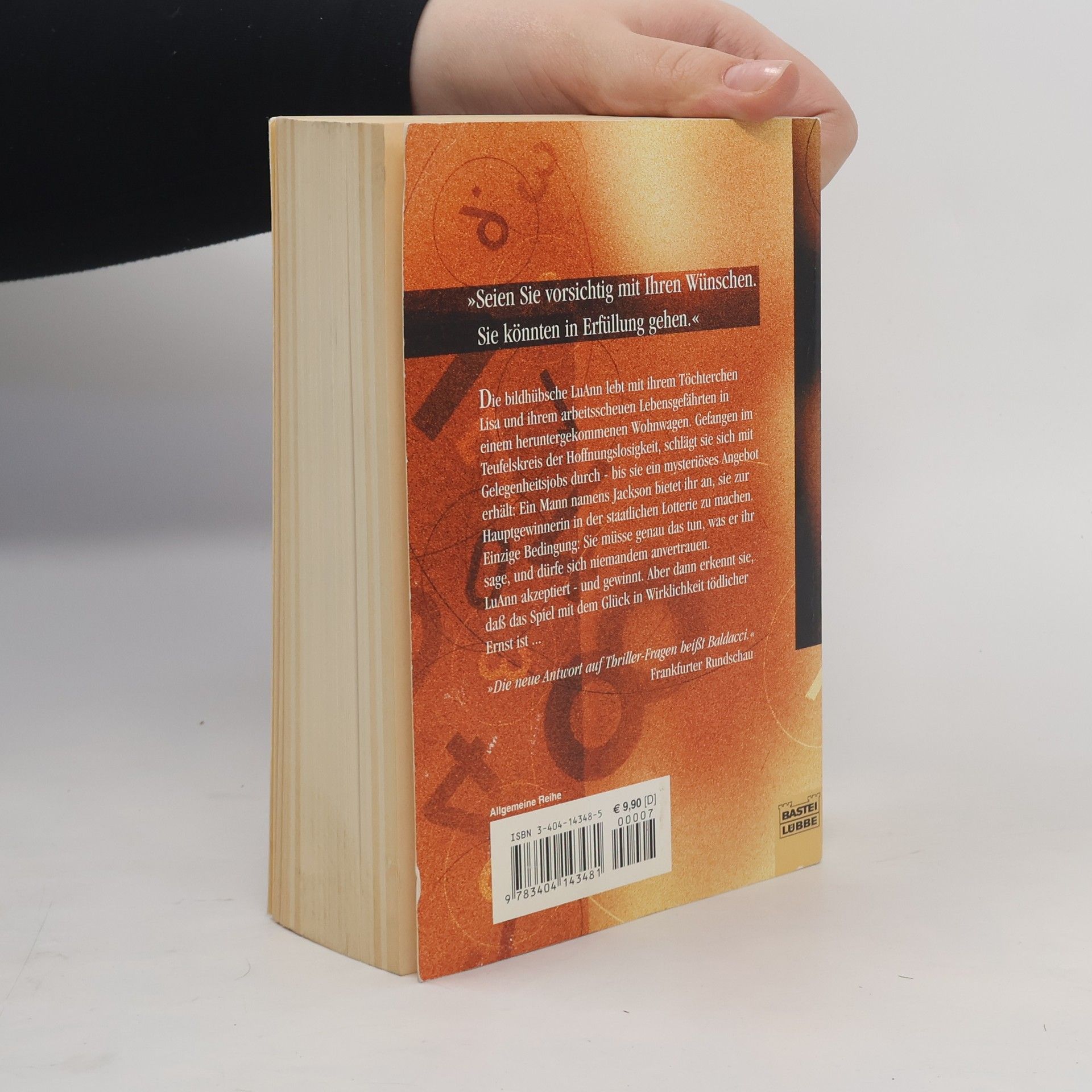 „Seien Sie vorsichtig mit Ihren Wünschen. Sie könnten in Erfüllung gehen.“ Die bildhübsche LuAnn lebt mit ihrem Töchterchen Lisa und ihrem arbeitsscheuen Lebensgefährten in einem heruntergekommenen Wohnwagen. Gefangen im Teufelskreis der Hoffnungslosigkeit, schlägt sie sich mit Gelegenheitsjobs durch – bis sie ein mysteriöses Angebot erhält: Ein Mann namens Jackson bietet ihr an, sie zur Hauptgewinnerin in der staatlichen Lotterie zu machen. Einzige Bedingung: Sie müsse genau das tun, was er ihr sage, und dürfe sich niemand anvertrauen. LuAnn akzeptiert – und gewinnt. Aber dann erkennt sie, daß das Spiel mit dem Glück in Wirklichkeit tödlicher Ernst ist ... „Die Versuchung“ von Bestsellerautor David Baldacci ist ein spannender Thriller über Glück und Unglück, Leben und Tod.