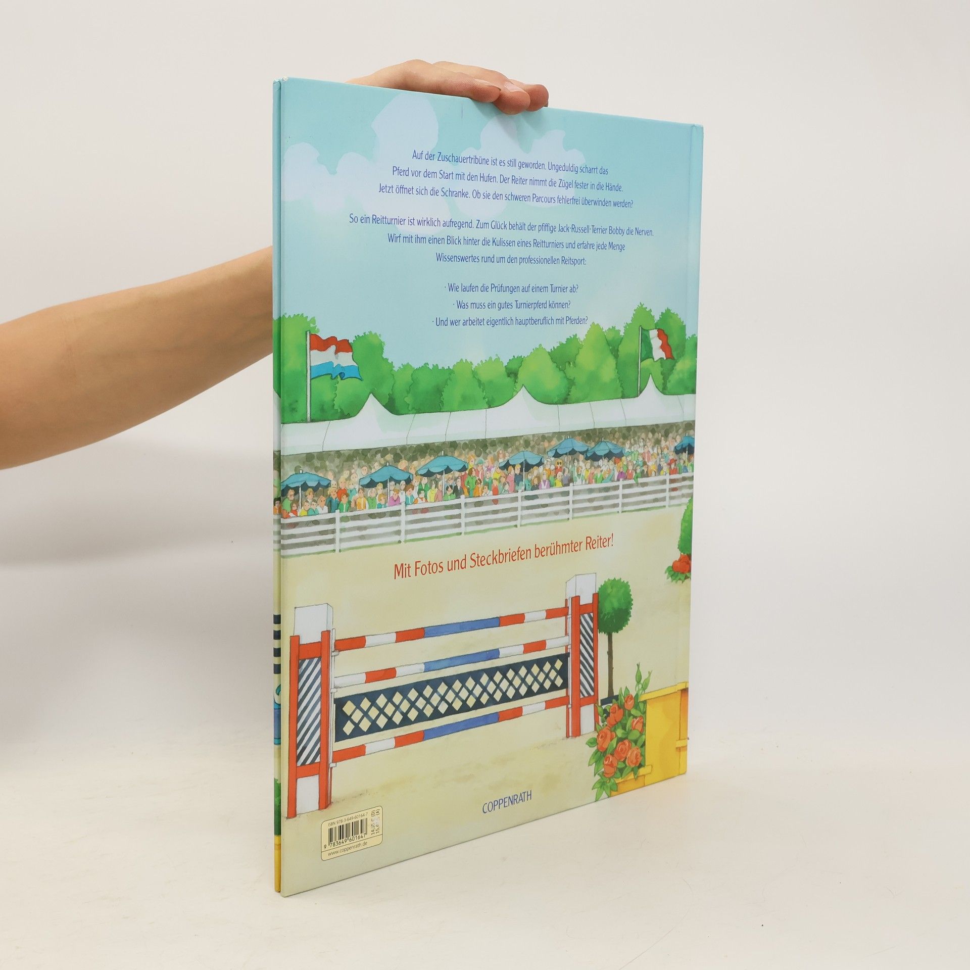 Dieses Buch ermöglicht allen Pferdefreunden den Blick hinter die Kulissen eines großen Reitturniers. Der pfiffige Jack-Russell-Terrier Bobby führt über den Turnierplatz und gibt kindgerechte Antworten auf viele Fragen rund um den professionellen Reitsport: Wie laufen die Prüfungen auf einem Turnier ab? Was muss ein gutes Turnierpferd können? Und wer arbeitet eigentlich alles hauptberuflich mit Pferden? Darüber hinaus vermittelt das Buch jede Menge zusätzliches Wissen zu Themen wie Pferdehaltung oder Pferdesprache und geht mit viel Feingefühl auf das so besondere Verhältnis zwischen Pferd und Reiter ein. -Mit einem Vorwort von Otto Becker, dem Bundestrainer der dt. Springreiter -Mit Fotos des bekannten Pferdefotografen Jacques Toffi u. a. -Mit Fotos und Steckbriefen bekannter Reiter