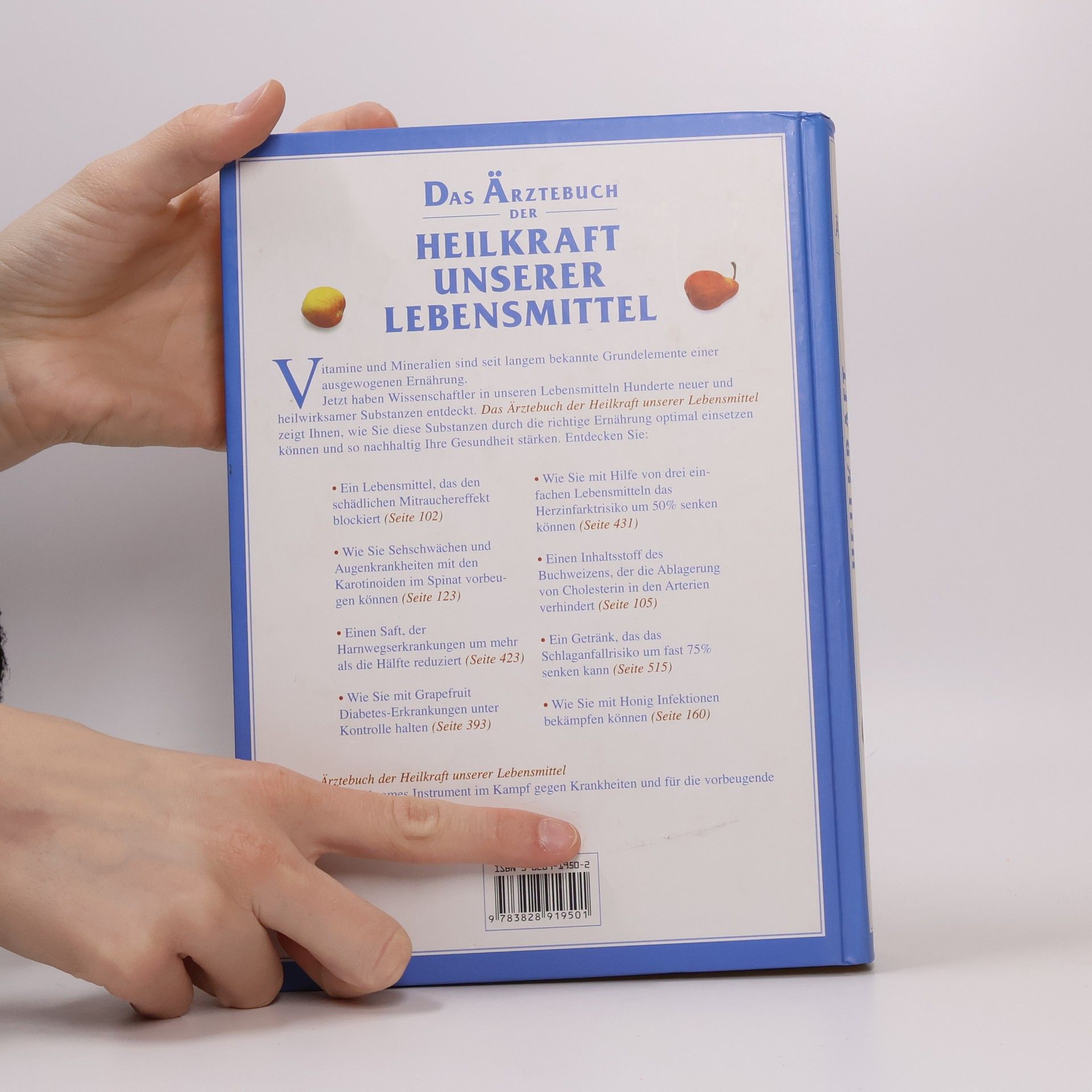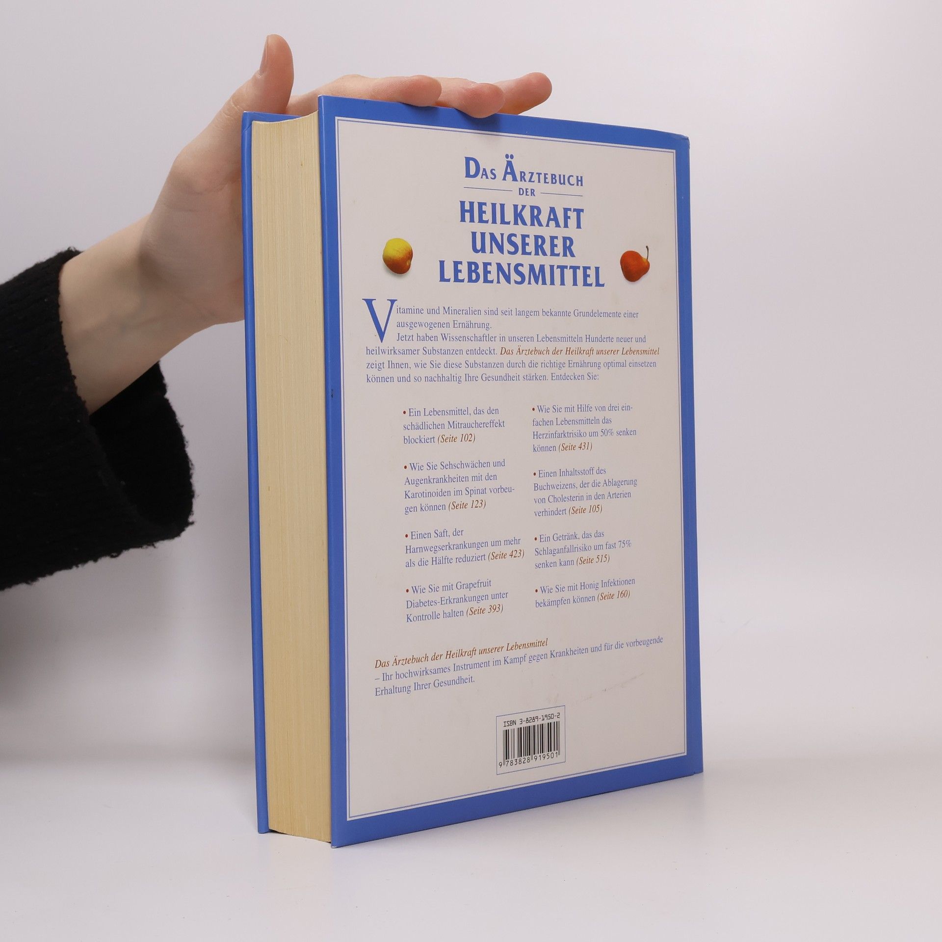 Vitamine und Mineralien sind seiz langem bekannte Grundelemente einer ausgewogenen Ernährung. Jetzt haben Wissenschaftler in unseren Lebensmitteln Hunderte neuer und wirksamer Substanzen entdeckt. Das Ärztebuch der Heilkraft unserer Lebensmittel zeigt Ihnen, wie sie diese Substanzen durch die richtige Ernährung optimal einsetzen können und so nachhaltig Ihre Gesundheit stärken. Entedecken Sie: - Ein Lebensmittel, das den schädlichen Mitrauchereffekt blockiert - Wie Sie Sehschwächen und Augenkrankheiten mit den Karotinoiden im Spinat vorbeugen können - Einen Saft, der Harnwegserkrankungen, um mehr als die Hälfte reduziert - Wie Sie mit Grapfruit Diabees-Erkrankungen unter ontrolle halten - Wie Sie mit Hilfe von drei einfachen Lebensmitteln das Herzinfarktrisiko um 50% senken können - Einen Inhaltsstoff des Buchweizens, der die Ablagerung von Cholesterin in den Arterien verhindert - Ein Getränk, das das Schlaganfallrisiko um fast 75% senken kann - Wie Sie mit Honig Infektionen bekämpfen können Das Ärztebuch unserer Lebensmittel - Ihr hochwirksames Instrument im Kampf gegen Krankheiten und für die vorbeugende Erhaltung Ihrer Gesundheit.