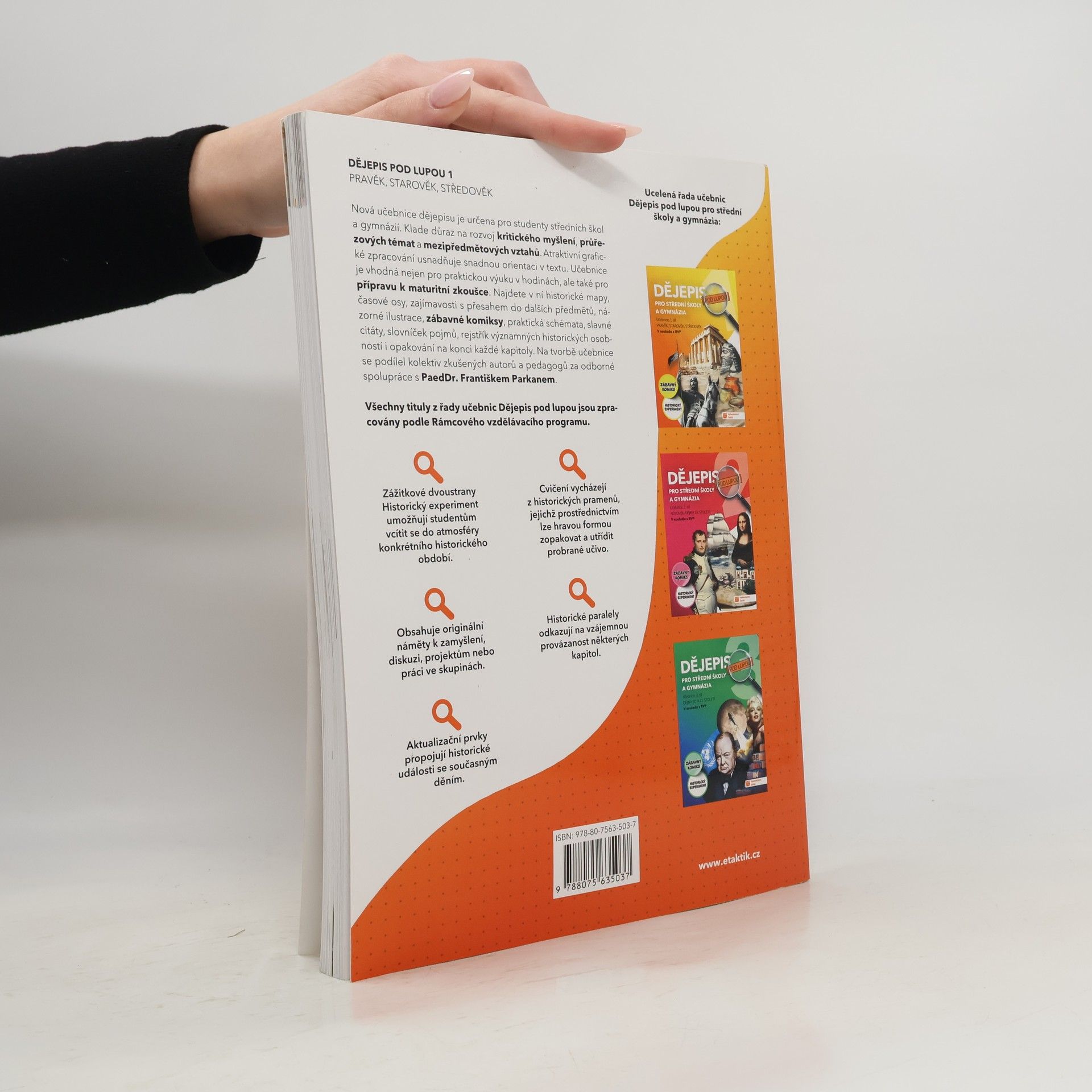 Nová učebnice dějepisu je určena pro studenty středních škol a gymnázií. Klade důraz na rozvoj kritického myšlení, průřezových témat a mezipředmětových vztahů. Atraktivní grafické zpracování usnadňuje snadnou orientaci v textu. Učebnice je vhodná nejen pro praktickou výuku v hodinách, ale také pro přípravu k maturitní zkoušce. Najdete v ní historické mapy, časové osy, zajímavosti s přesahem do dalších předmětů, názorné ilustrace, zábavné komiksy, praktická schémata, slavné citáty, slovníček pojmů, rejstřík významných historických osobností i opakování na konci každé kapitoly.