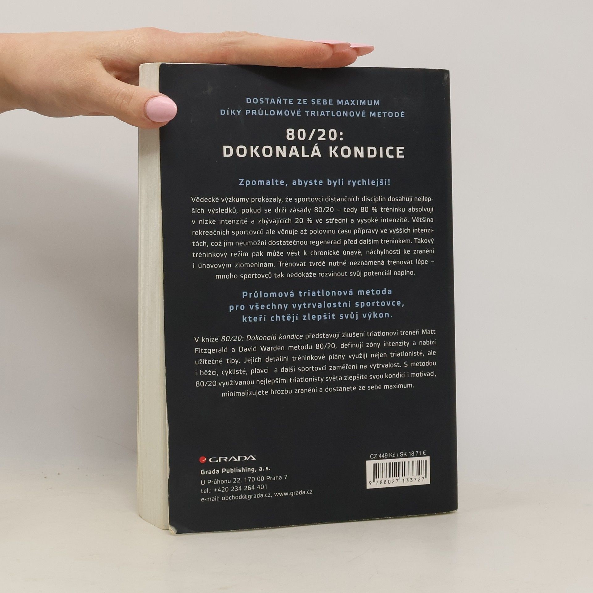 Zpomalte, abyste byli rychlejší! Vědecké výzkumy prokázaly, že sportovci distančních disciplín dosahují nejlepších výsledků, pokud se drží zásady 80/20 – tedy 80 % tréninku absolvují v nízké intenzitě a zbývajících 20 % ve střední a vysoké intenzitě. Většina rekreačních sportovců ale věnuje až polovinu času přípravy ve vyšších intenzitách, což jim neumožní dostatečnou regeneraci před dalším tréninkem. Takový tréninkový režim pak může vést k chronické únavě, náchylnosti ke zranění i únavovým zlomeninám. Trénovat tvrdě nutně neznamená trénovat lépe – mnoho sportovců tak nedokáže rozvinout svůj potenciál naplno. Průlomová triatlonová metoda pro všechny vytrvalostní sportovce, kteří chtějí zlepšit svůj výkon. V knize 80/20: Dokonalá kondice představují zkušení triatlonoví trenéři Matt Fitzgerald a David Warden metodu 80/20, definují zóny intenzity a nabízí užitečné tipy. Jejich detailní tréninkové plány využijí nejen triatlonisté, ale i běžci, cyklisté, plavci a další sportovci zaměření na vytrvalost. S metodou 80/20 využívanou nejlepšími triatlonisty světa zlepšíte svou kondici i motivaci, minimalizujete hrozbu zranění a dostanete ze sebe maximum.