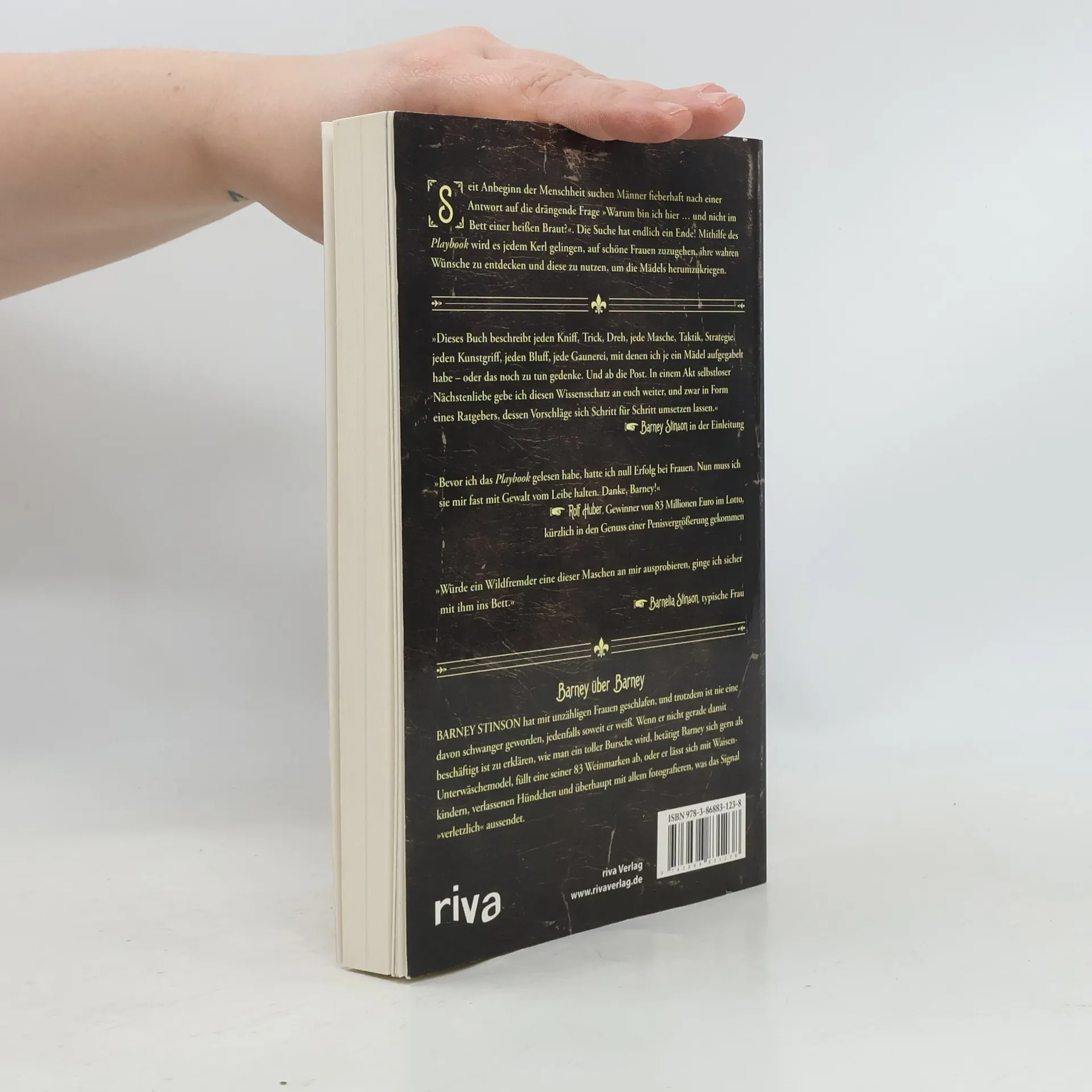 Barney Stinson, Held der erfolgreichen Fernsehserie „How I met your mother“, kriegt die Mädels mit kleinen Kniffen reihenweise rum. Nun verrät er in einem Buch alle seine Tricks, die garantiert zum Erfolg führen, auch bei Jungs, die im Umgang mit anderen Menschen – und vor allem anderen Frauen - wenig Geschick ha-ben. In „Das Playbook“ beschreibt Barney Stinson mehr als 75 Methoden, mit denen sich garantiert jede Frau anbaggern lässt. Hier erfährt der Leser alles über Barneys tolle Maschen: den SNASA-Trick („Nein, nicht für die NASA, ich arbeite für die Geheimabteilung – die Secret NASA.“) oder den Cheap Trick-Trick („Yo, ich bin der Bassist von Cheap Trick“, denn Frauen sind begeistert, wenn ein Mann in einer Band spielt, egal in was für einer). Und das Schöne an seinen Strategien ist, dass die meisten dieser Schachzüge keine Erfahrung und auch keine Vorbereitung erfordern. Jeder kann sofort loslegen. „Das Playbook“ ist das ultimative Lebens-hilfebuch für alle Männer, die auf der Suche nach Frauen sind. Oder frei nach Barney Stinson: „Also, werft euch in Schale, macht euch bereit und lernt . . . wie man der Größte wird. “