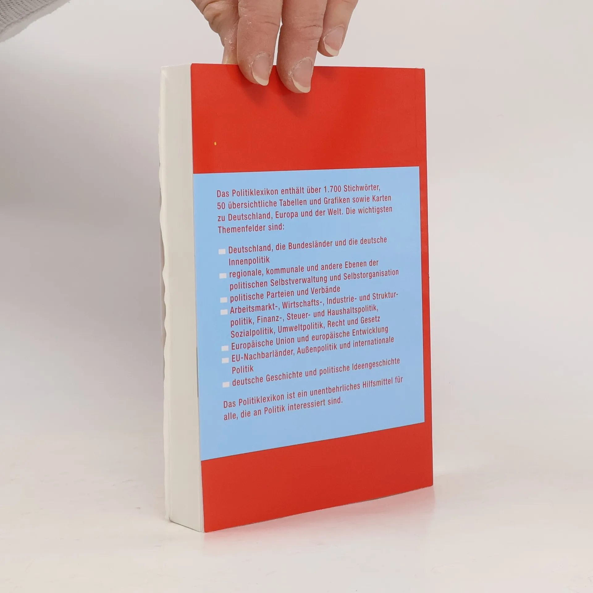 Immer wieder neu, stets aktuell: Das bewährte Lexikon im Taschenbuchformat geht in seine 8. Auflage. Überarbeitet und erweitert im Corona- und Bundestagswahljahr, mit über 1.700 Stichwörtern und mehr als 50 übersichtlichen, nützlichen Tabellen und Grafiken sowie Karten zu Deutschland, Europa und der Welt. Ein unentbehrliches Hilfsmittel für alle politisch interessierten und aktiven Leserinnen und Leser. Das Nachschlagewerk in gut verständlicher Sprache liefert kurzgefasste, einführende Informationen zu zentralen Begriffen der Innen- und Außenpolitik, der politischen Selbstverwaltung und Selbstorganisation, zu Parteien und Verbänden, Arbeitsmarkt, Wirtschaft, Finanzen, Steuer- und Haushaltspolitik, Sozialpolitik, Umweltpolitik, Recht und Gesetz, zur Europäischen Union oder auch politischen Ideengeschichte. Es enthält detaillierte Informationen zu allen 16 Ländern bzw. Stadtstaaten der Bundesrepublik Deutschland und grundlegende Informationen zu den Mitgliedsstaaten, allen Nachbarstaaten der Europäischen Union, den sogenannten G 7-Staaten sowie Russland und China.
