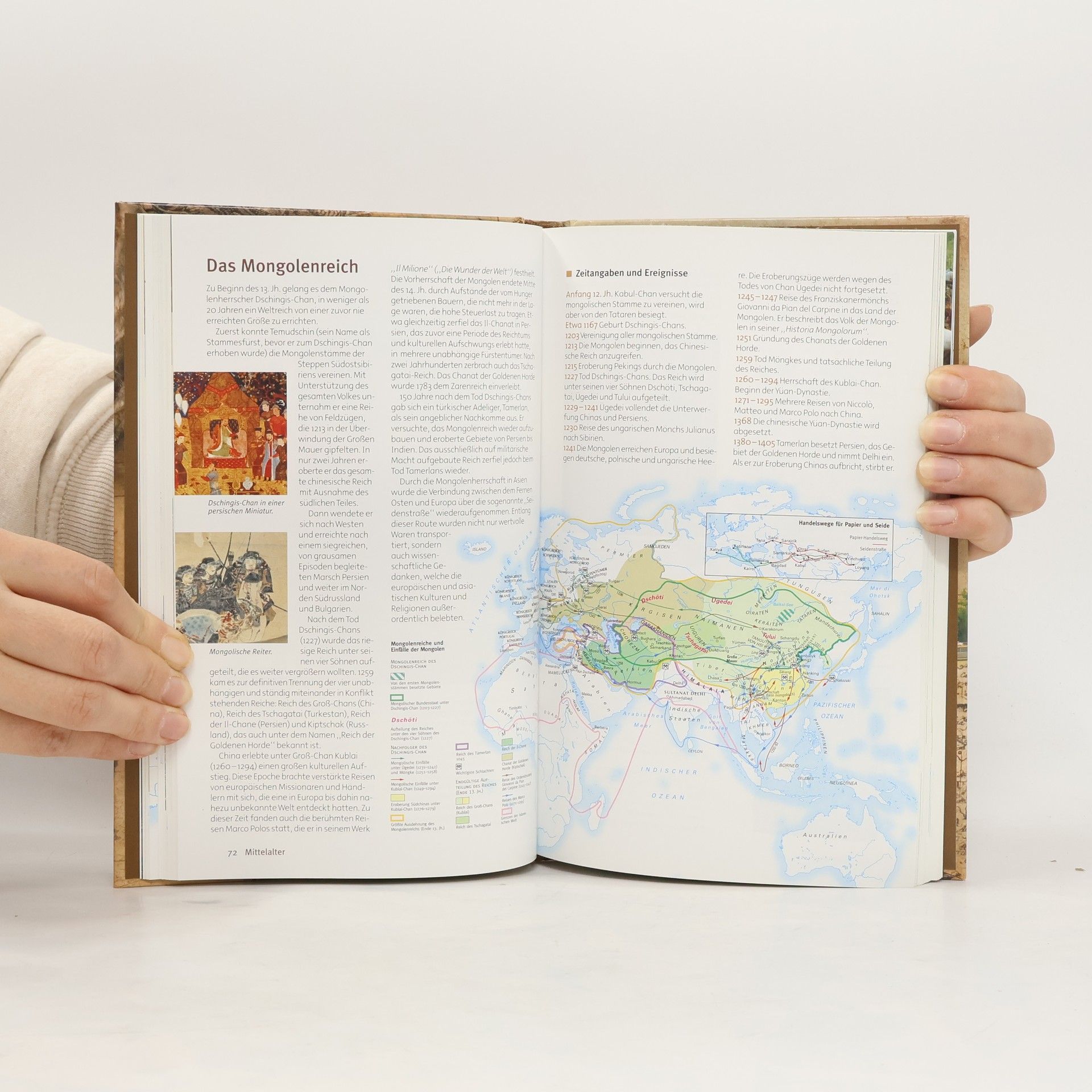 Dieses umfassende Nachschlagewerk enthält die wichtigsten Etappen der Geschichte – von den ersten Menschen über die Entwicklung der Schrift, die Kreuzzüge, Entdeckungen und Erfindungen bis zu den Revolutionen, den Weltkriegen und aktuellen Ereignissen des 21. Jahrhunderts. Mehr als 160 Karten und zahlreiche Zeittafeln sowie farbige Abbildungen veranschaulichen die historische Entwicklung.