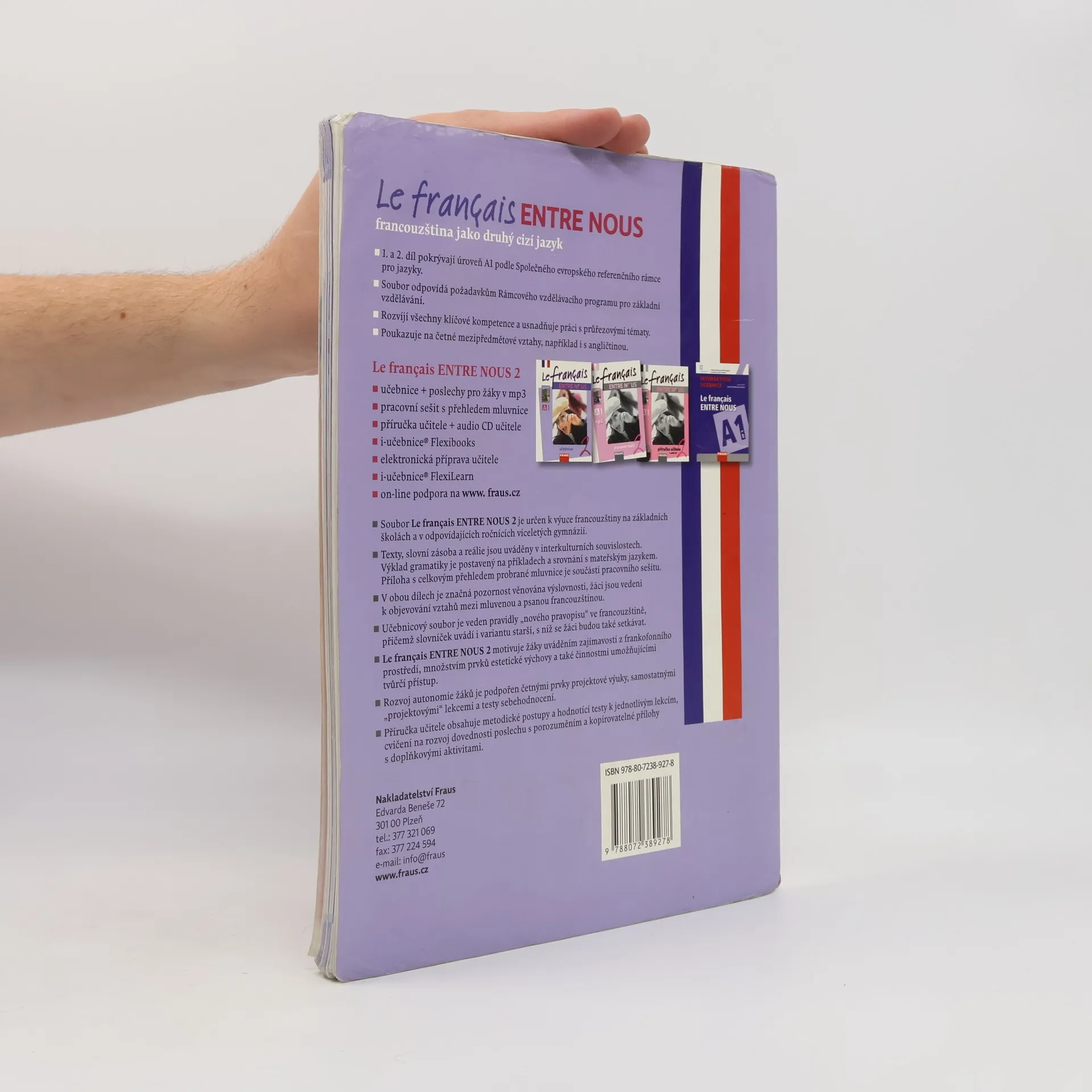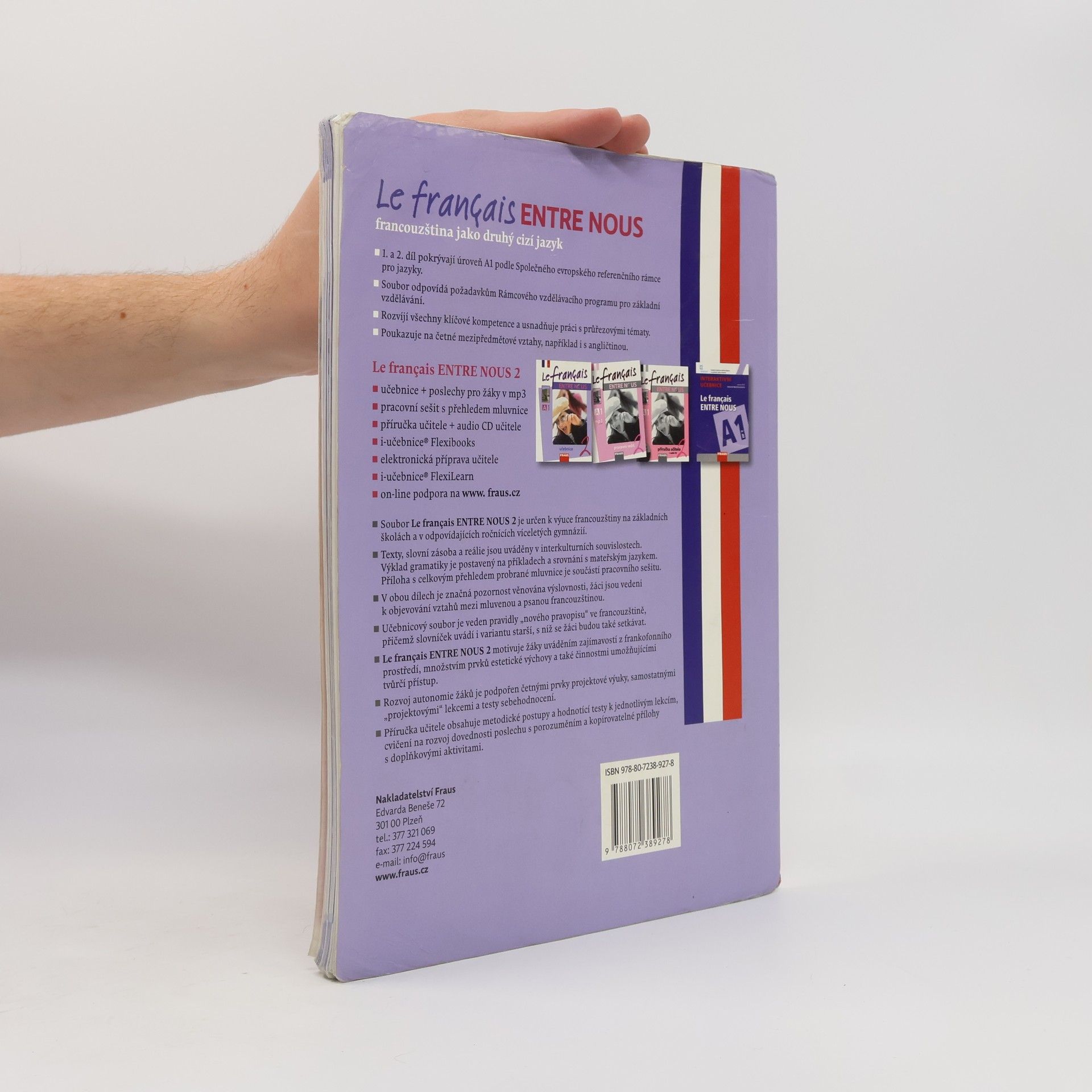 Dvoudílný soubor učebnic je určen pro výuku francouzštiny jako dalšího cizího jazyka v 7. a 8. ročníku základních škol nebo na víceletých gymnáziích. První a druhý díl pokrývají úroveň A1 podle SERR. Na stránce 6 najdete důvody, proč se vyplatí francouzštinu poznat, v 1. dílu česky a ve 2. dílu francouzsky. Název učebnice „Le français ENTRE NOUS“ zdůrazňuje význam francouzštiny v současném světě a zaměřuje se na opravdovou komunikaci ve třídě. Učebnice je také zábavným společníkem při poznávání kultury frankofonních zemí a Evropské unie, a rozvíjí důležité dovednosti v komunikaci ve francouzštině. Mezi přednosti učebnice patří: - jako první dvoujazyčná učebnice je vedena pravidly „nového pravopisu“ a obsahuje variantu starší ve slovníčku - důraz na postupné osvojování zvukové stránky francouzštiny - metoda ukazuje mezipředmětové vztahy, např. s angličtinou - obsahuje podněty k interkulturní výchově a využívá prvky projektového vyučování - dostupná v interaktivní podobě pro tabule, tablety, PC a notebooky - zdarma aplikace WordTrainer FRAUS pro procvičování slovní zásoby z jednotlivých lekcí.