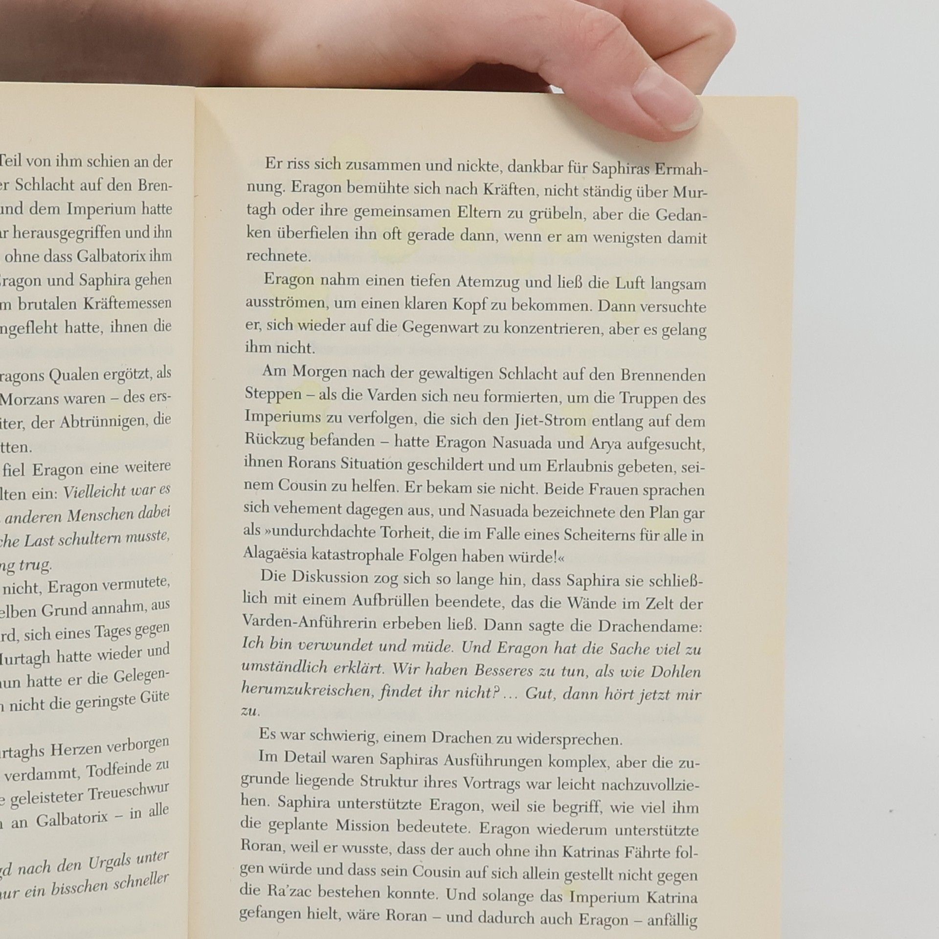 Schlachten, große Abenteuer und ein Tod, der alles verändert Über Alagaësia brauen sich erneut die dunklen Wolken des Krieges zusammen. Ohne die magischen Fähigkeiten Eragons sind die Varden, Elfen und Zwerge verloren. Aber der Drachenreiter will seinen Schwur nicht brechen: Er muss Katrina, die Geliebte seines Cousins Roran, aus den Fängen der Ra’zac befreien. Und so tritt er eine abenteuerliche Reise an, die ihn und seinen Drachen Saphira weit über die Grenzen des Königreiches führen wird.