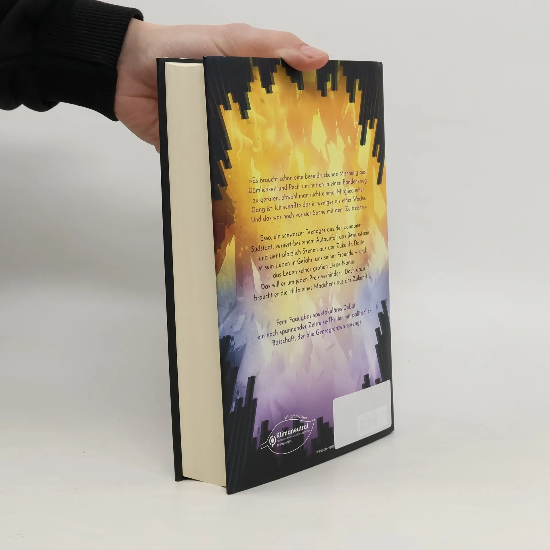 Zwei Gangs, zwei Zeiten, zwei Welten und eine Chance Esso, ein afrikanischstämmiger Teenager aus dem Süden Londons, gehört zwar keiner Gang an, doch er ist zur falschen Zeit am falschen Ort. Weil er zugesehen hat, wie ein berüchtigtes Gangmitglied zusammengeschlagen wurde, muss er um sein Leben fürchten. Als er vor ein Auto läuft und bewusstlos wird, entdeckt er, dass er Zugang zu einer anderen Welt hat – er kann dort Szenen seines zukünftigen Lebens sehen. Und etwas, was er unbedingt verhindern möchte. Im Jahr 2035 kämpft Rhia mit anderen Problemen: Sie ist ohne Eltern aufgewachsen, ihr Fußballtalent ist die einzige Chance auf eine bessere Zukunft. Da bekommt sie einen neuen Schultutor: Esso. Niemand weiß, wo er herkommt, doch er trägt ein Bild von Rhias Mutter bei sich. Und er erzählt ihr, dass er ihre Hilfe braucht: Rhia ist seine einzige Hoffnung, sein Leben zu retten, das seiner Freunde und das seiner großen Liebe Nadia … Femi Fadugbas spektakuläres Debüt: ein hoch spannender Zeitreise-Thriller mit politischer Botschaft, der alle Genregrenzen sprengt