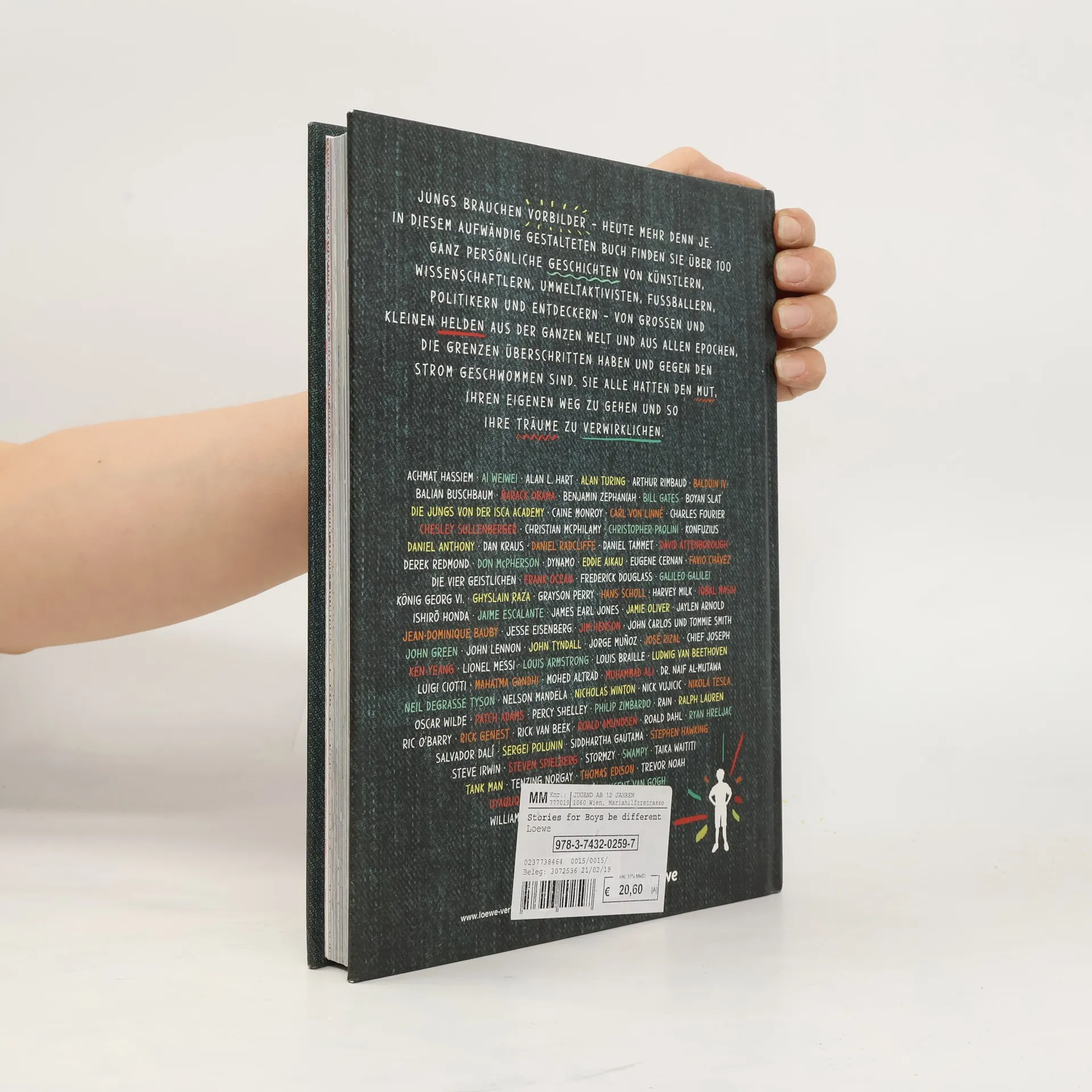 Das Buch ist bei deiner Buchhandlung vor Ort und bei vielen Online-Buchshops erhältlich! Ausgezeichnet als „Children’s Book of the Year“ beim Britischen National Book Award 2018! Jungs brauchen Vorbilder – heute mehr denn je. In diesem aufwändig gestalteten Buch finden sie über 100 persönliche Geschichten von Künstlern, Wissenschaftlern, Umweltaktivisten, Fußballern, Politikern und Entdeckern – von großen und kleinen Helden aus aller Welt und allen Epochen, die Grenzen überschritten und gegen den Strom geschwommen sind. Sie hatten den Mut, ihren eigenen Weg zu gehen und ihre Träume zu verwirklichen. Nach dem Erfolg von Good Night Stories for Rebel Girls gibt es nun eine inspirierende Geschichtensammlung für Jungs. Autor Ben Brooks erzählt von Persönlichkeiten, die Erstaunliches erreicht und die Welt auf ihre Weise verbessert haben – jenseits von stereotypen Männlichkeitsbildern. Man muss sich nicht mit großen Kämpfern identifizieren, um zum Helden zu werden. Dieses Buch zeigt, dass auch Querdenker und sensible oder introvertierte Jungen Außergewöhnliches leisten können. Es ist randvoll mit Abenteuern und spannenden Geschichten, die kleine und große Jungs bestärken, ihren eigenen Weg zu gehen. „Dieses Buch kann Leben retten. Dieses Buch kann Leben verändern.“ - Benjamin Zephaniah. Mit Biografien von Persönlichkeiten wie Barack Obama, Mahatma Gandhi, Stephen Hawking und vielen mehr.