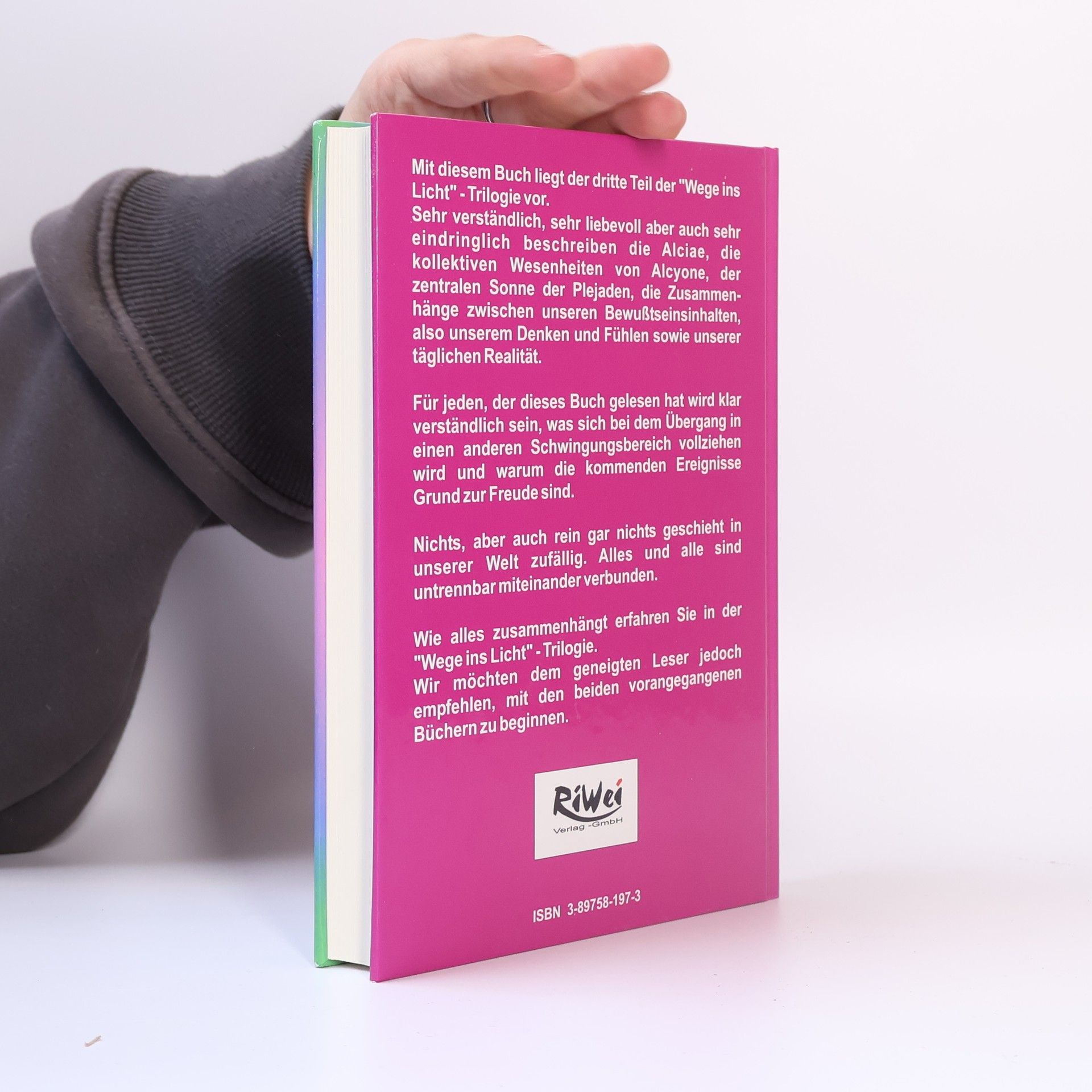 Mit diesem Buch liegt der dritte Teil der „Wege ins Licht“-Trilogie vor. Sehr verständlich, sehr liebevoll aber auch sehr eindringlich beschreiben die Alciae, die kollektiven Wesenheiten von Alcyone, der zentralen Sonne der Plejaden, die Zusammenhänge zwischen unseren Bewußtseinsinhalten, also unserem Denken und Fühlen sowie unserer täglichen Realität. Für jeden, der dieses Buch gelesen hat wird klar verständlich sein, was sich bei dem Übergang in einen anderen Schwingungsbereich vollziehen wird und warum die kommenden Ereignisse Grund zur Freude sind. Nichts, aber auch rein gar nichts geschieht in unserer Welt zufällig. alles und alle sind untrennbar miteinander verbunden. Wie alles zusammenhängt erfahren Sie in der „Wege ins Licht“-Trilogie. Wir möchten dem geneigten Leser jedoch empfehlen, mit den beiden vorangegangenen Büchern zu beginnen.