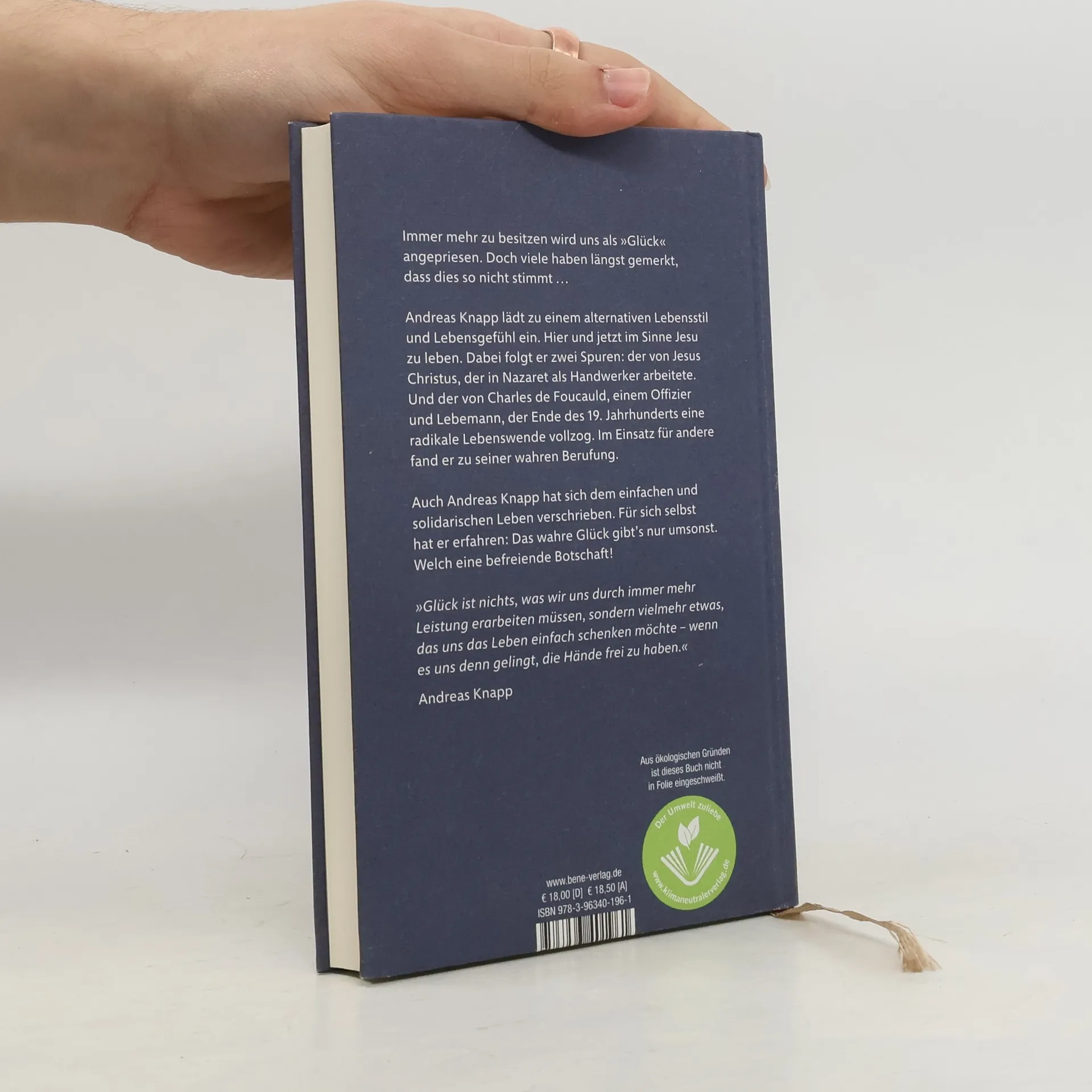 Wahres Glück gibt's nur umsonst! Dieses Buch lädt zu einem alternativen Lebensstil und Lebensgefühl ein. Hier und jetzt im Sinne Jesu zu leben. Nicht ohnmächtig auf die Mechanismen einer globalisierten Wirtschaftswelt zu starren, sondern selbst anders zu wirtschaften. Sich nicht lähmen lassen von negativen Meldungen, sondern an die gute Nachricht, an die Frohe Botschaft zu glauben. Andreas Knapp folgt dabei den Spuren von Charles de Foucauld, der am 15. Mai 2022 von Papst Franziskus heilig gesprochen wurde. Ende des 19. Jahrhunderts vollzog Charles de Foucauld eine radikale Lebenswende: vom Partylöwen und Offizier zum Einsiedler. Im Einsatz für andere Menschen fand er zu seiner wahren Berufung. Andreas Knapp gehört zur Gemeinschaft der Kleinen Brüder Jesu, die sich dem einfachen Leben verschrieben hat. Für sich selbst hat er erfahren, dass Glück nichts ist, was wir uns durch immer mehr Leistung erarbeiten müssen, sondern vielmehr etwas, das uns das Leben einfach schenken möchte – wenn es uns denn gelingt, die Hände frei zu haben!