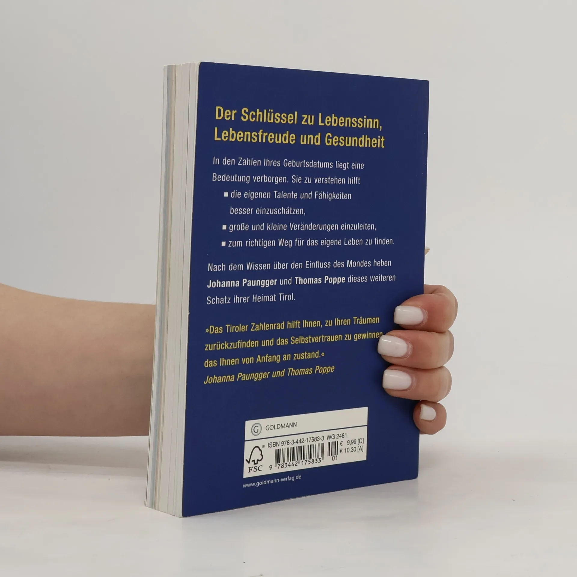 Der Schlüssel zu Lebenssinn, Lebensfreude und Gesundheit Nach dem Wissen über den Einfluss des Mondes heben Johanna Paungger und Thomas Poppe einen weiteren verschollenen Traditionsschatz ihrer Heimat: Sie verraten, welche Bedeutung in den Zahlen unseres Geburtsdatums verborgen liegt. Das große Tiroler Zahlenrad gibt Auskunft darüber, wie man seine Talente und Fähigkeiten besser einschätzen, große und kleine Veränderungen einleiten und zum richtigen Weg für sein Leben finden kann. Ausstattung: durchgehend 4-farbig