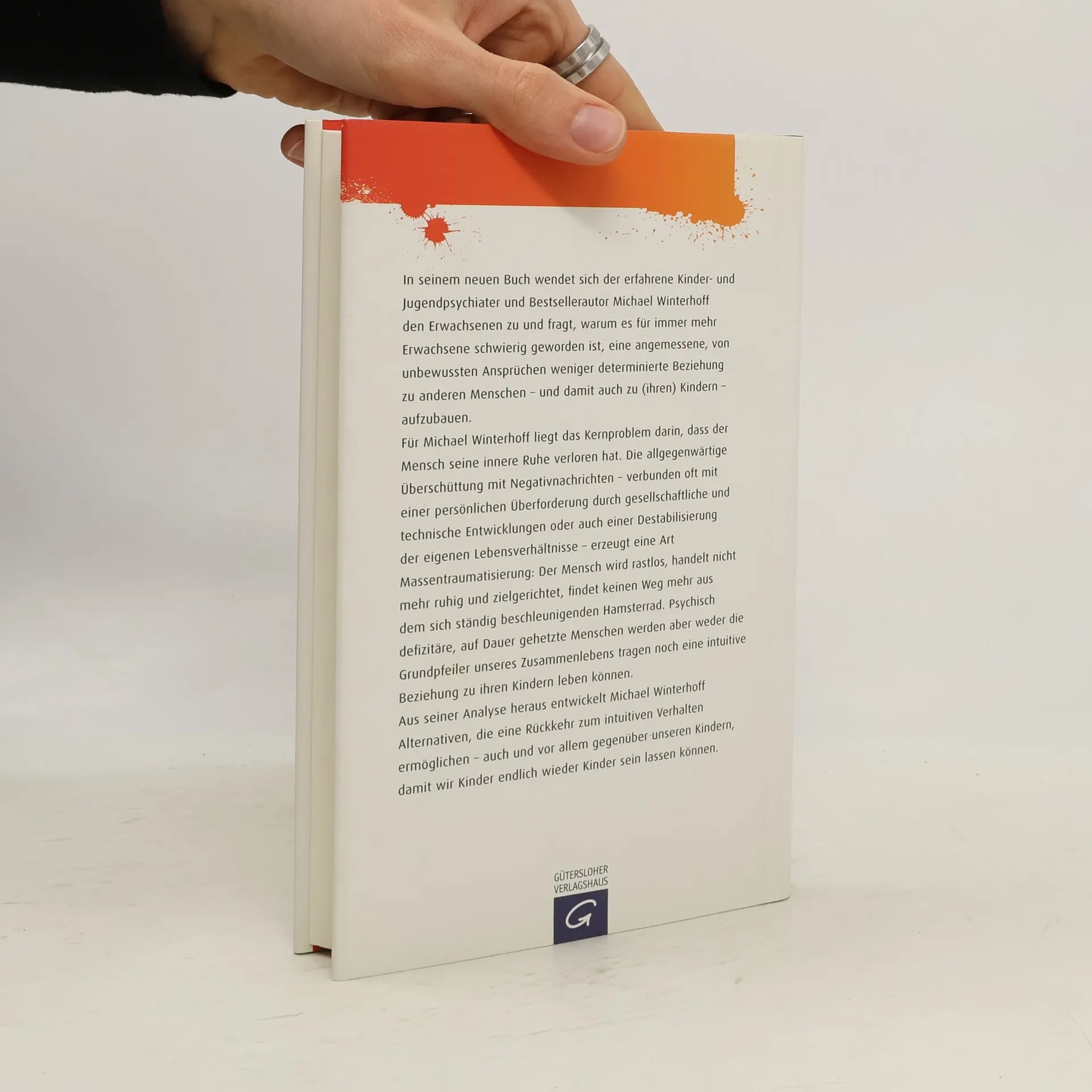 Die Rückkehr zur Intuition – damit Kinder wieder Kinder sein dürfen In seinem neuen Buch wendet sich der erfahrene Kinder- und Jugendpsychiater und Bestsellerautor Michael Winterhoff den Erwachsenen zu und fragt, warum es für immer mehr Erwachsene nicht mehr möglich ist, eine angemessene, von unbewussten Belastungen freie Beziehung zu anderen Menschen – und damit auch zu (ihren) Kindern – aufzubauen. Für Winterhoff liegt das Kernproblem darin, dass der Mensch seine innere Ruhe verloren hat. Die allgegenwärtige Penetration mit Negativnachrichten – verbunden mit einer vielfachen persönlichen Überforderung durch gesellschaftliche und technische Entwicklungen sowie einer Destabilisierung der eigenen Lebensverhältnisse - erzeugt eine Art Massentraumatisierung: Der Mensch wird rastlos, handelt nicht mehr ruhig und zielgerichtet, findet keinen Weg mehr aus dem sich ständig beschleunigenden Hamsterrad. Psychisch defizitäre, auf Dauer gehetzte Menschen aber werden die Grundpfeiler unseres Zusammenlebens nicht mehr tragen können.Dabei zerstört Winterhoff zwar das Trugbild einer grenzenlosen Freiheit, in der wir uns heute wähnen, weist aber auch Wege aus dem Dilemma auf. Aus seiner Analyse heraus entwickelt er Alternativen, die eine Rückkehr zum intuitiven Verhalten ermöglichen – auch und vor allem gegenüber unseren Kindern, damit Kinder endlich wieder Kinder sein dürfen.