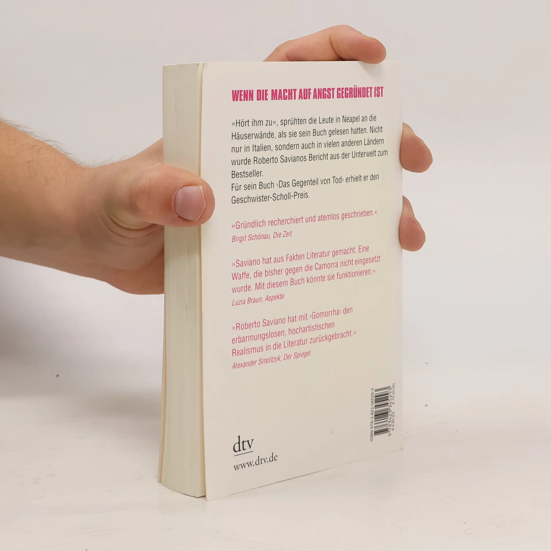 Die süditalienische Camorra ist tief im internationalen Drogenhandel verwickelt, transportiert große Mengen Giftmüll und dominiert den Textil- sowie Zementhandel. Ihre Aktivitäten erstrecken sich bis nach Deutschland, Schottland und China und fordern jährlich hunderte von Opfern. Der junge Journalist Roberto Saviano, selbst aus Neapel stammend, hat unter Lebensgefahr vor Ort recherchiert und ein eindringliches Buch verfasst, das die Macht der Camorra beleuchtet. Diese beruht auf Schweigen, dem Saviano die Kraft des Wortes entgegensetzt. Aufgrund seiner Enthüllungen lebt er seitdem versteckt und wird von Bodyguards beschützt. Für sein engagiertes Schreiben erhielt Saviano 2009 den Geschwister-Scholl-Preis, nicht nur für sein Buch, sondern für seinen gesamten Beitrag zur Aufklärung über die Verbrechen der Camorra. In seiner Dankesrede thematisiert er den täglichen Kampf gegen die Einschüchterungen und die Notwendigkeit, trotz aller Bedrohungen zu schreiben. Für ihn bedeutet Schreiben, sich nicht von Angst und Verzweiflung besiegen zu lassen und dem eigenen Gewissen treu zu bleiben.
