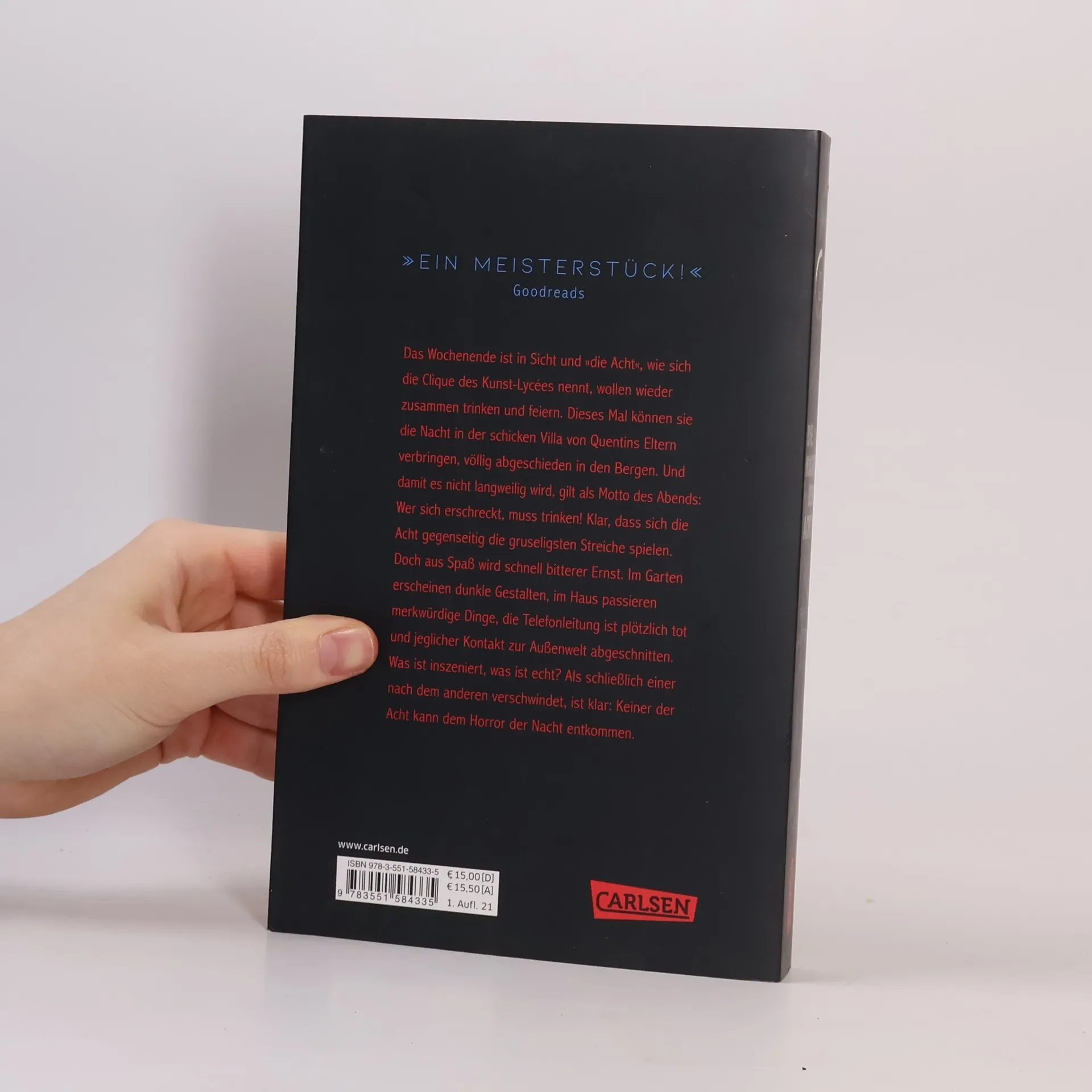 Acht Jugendliche, ein Haus und eine Nacht, die zum Horrortrip wird! Es ist Samstagabend und Quentin lädt zum Trinken und Feiern in die schicke Villa seiner Eltern ein. Abgeschieden in den Bergen gelegen, ist sie der perfekte Ort des heutigen Mottos: Wer sich erschreckt, muss trinken! Doch aus Spaß wird schnell bitterer Ernst. Die ersten blutigen Finger bringen die Gruppe noch zum Lachen, es wird ordentlich getrickst. Als der Geist einer tot geglaubten Mitschülerin auftaucht und die Telefonleitung plötzlich gekappt ist, läuft der Abend aus dem Ruder. Die Acht sind auf sich allein gestellt. Und alle stellen sich dieselbe Frage: Wer steckt hinter den mysteriösen Vorfällen? Die Nacht will kein Ende nehmen ... Als dann auch noch einer nach dem anderen verschwindet, scheint keiner mehr dem Horror zu entkommen. Gruselig-spannender Horrorthriller, der bis zur letzten Seite atemlos macht!