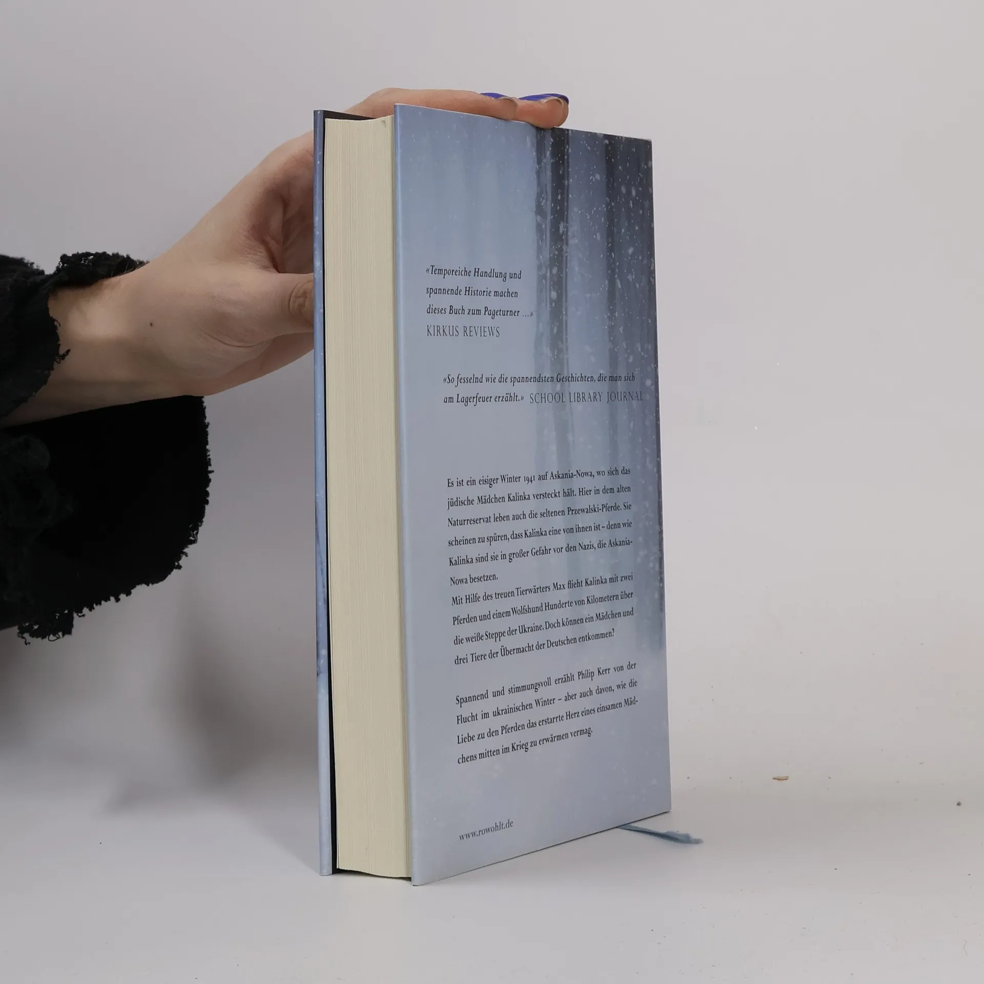 Es ist ein eisiger Winter 1941 auf Askania-Nowa, wo sich das jüdische Mädchen Kalinka versteckt hält. Hier in dem alten Naturreservat leben auch die seltenen Przewalski-Pferde. Sie scheinen zu spüren, dass Kalinka eine von ihnen ist – denn wie Kalinka sind sie in großer Gefahr vor den Nazis, die Askania-Nowa besetzen. Mit Hilfe des treuen Tierwärters Max flieht Kalinka mit zwei Pferden und einem Wolfshund Hunderte von Kilometern über die weiße Steppe der Ukraine. Doch können ein Mädchen und drei Tiere der Übermacht der Deutschen entkommen? Spannend und stimmungsvoll erzählt Philip Kerr von der Flucht im ukrainischen Winter – aber auch davon, wie die Liebe zu den Pferden das erstarrte Herz eines einsamen Mädchens mitten im Krieg zu erwärmen vermag.
