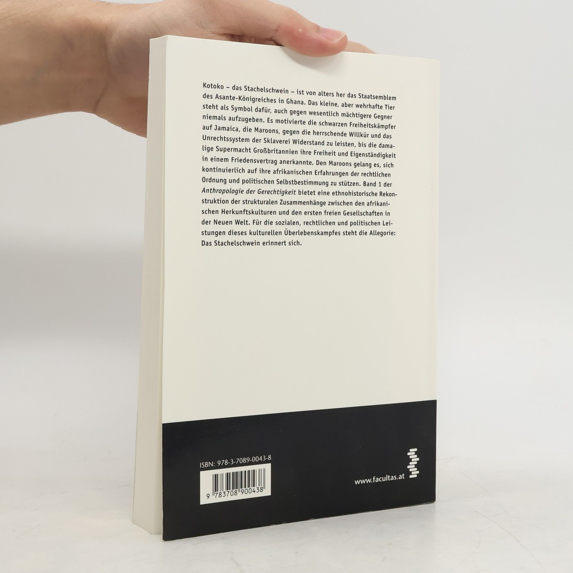 Kotoko – das Stachelschwein – ist von alters her das Staatsemblem des Asante-Königreiches in Ghana. Das kleine, aber wehrhafte Tier steht als Symbol dafür, auch gegen wesentlich mächtigere Gegner niemals aufzugeben. Es motivierte die schwarzen Freiheitskämpfer auf Jamaica, die Maroons, gegen die herrschende Willkür und das Unrechtssystem der Sklaverei Widerstand zu leisten, bis die damalige Supermacht Großbritannien ihre Freiheit und Eigenständigkeit in einem Friedensvertrag anerkannte. Den Maroons gelang es, sich kontinuierlich auf ihre afrikanischen Erfahrungen der rechtlichen Ordnung und politischen Selbstbestimmung zu stützen. Band 1 der Anthropologie der Gerechtigkeit bietet eine ethnohistorische Rekonstruktion der strukturalen Zusammenhänge zwischen den afrikanischen Herkunftskulturen und den ersten freien Gesellschaften in der Neuen Welt. Für die sozialen, rechtlichen und politischen Leistungen dieses kulturellen Überlebenskampfes steht die Allegorie: Das Stachelschwein erinnert sich.