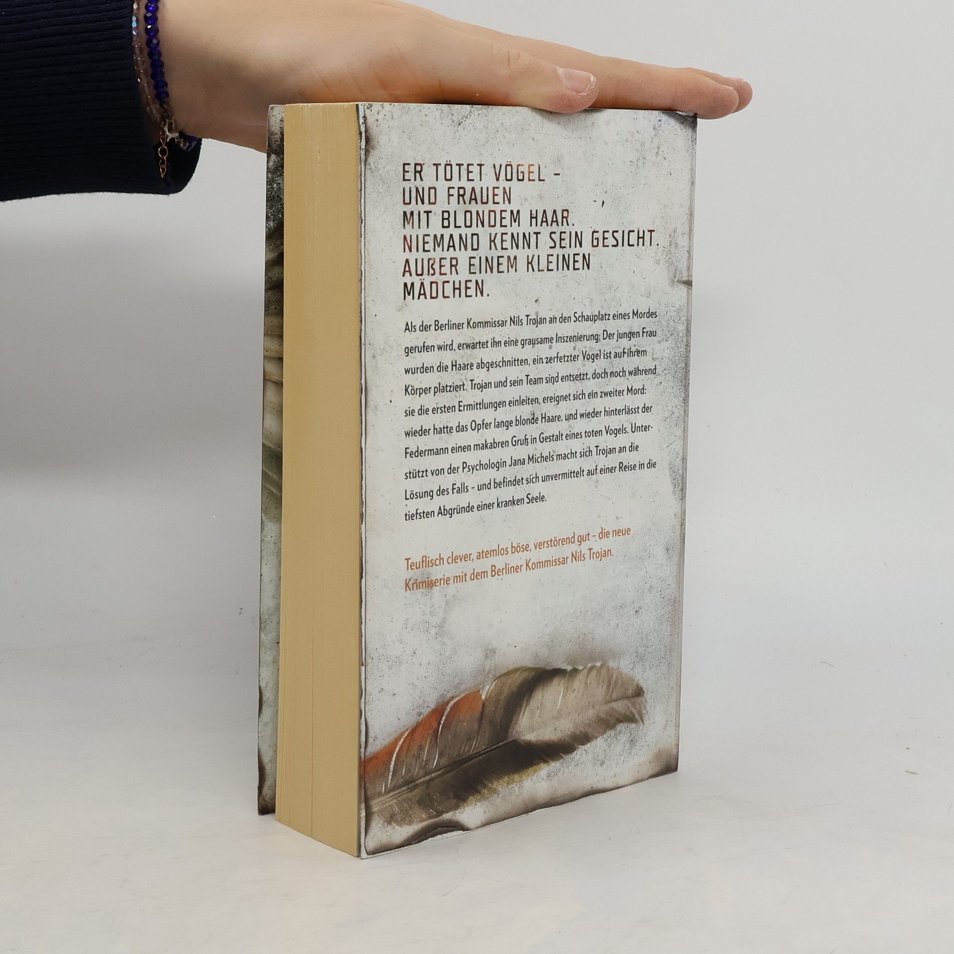 Schrei doch, dachte er, schrei Als der Berliner Kommissar Nils Trojan an den Schauplatz eines Mordes gerufen wird, erwartet ihn eine grausame Inszenierung: Der jungen Frau wurden die Haare abgeschnitten, ein zerfetzter Vogel ist auf ihrem Körper platziert. Trojan und sein Team sind entsetzt, doch noch während sie die ersten Ermittlungen einleiten, ereignet sich ein zweiter Mord - wieder hatte das Opfer lange blonde Haare, und wieder hinterlässt der Federmann einen makabren Gruß in Gestalt eines toten Vogels. Trojan hofft, durch die kleine Tochter der Ermordeten einen Hinweis zu bekommen, doch dann verschwindet das Mädchen von einem Tag auf den anderen. Unterstützt von der Psychologin Jana Michels macht sich Trojan an die Lösung des Falls - und befindet sich unvermittelt auf einer Reise in die tiefsten Abgründe einer kranken Seele.