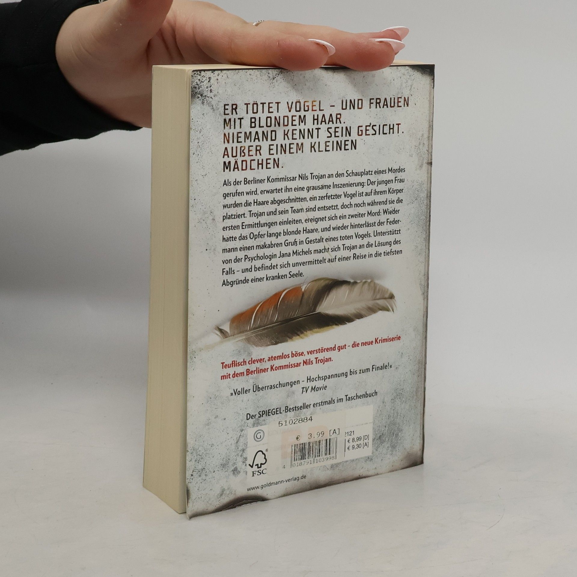 Als der Berliner Kommissar Nils Trojan an den Schauplatz eines Mordes gerufen wird, erwartet ihn eine grausame Inszenierung: Der jungen Frau wurden die Haare abgeschnitten, ein zerfetzter Vogel ist auf ihrem Körper platziert. Trojan und sein Team sind entsetzt, doch noch während sie die ersten Ermittlungen einleiten, ereignet sich ein zweiter Mord: Wieder hatte das Opfer lange blonde Haare, und wieder hinterlässt der Federmann einen makabren Gruß in Gestalt eines toten Vogels. Unterstützt von der Psychologin Jana Michels macht sich Trojan an die Lösung des Falls – und befindet sich unvermittelt auf einer Reise in die tiefsten Abgründe einer kranken Seele.