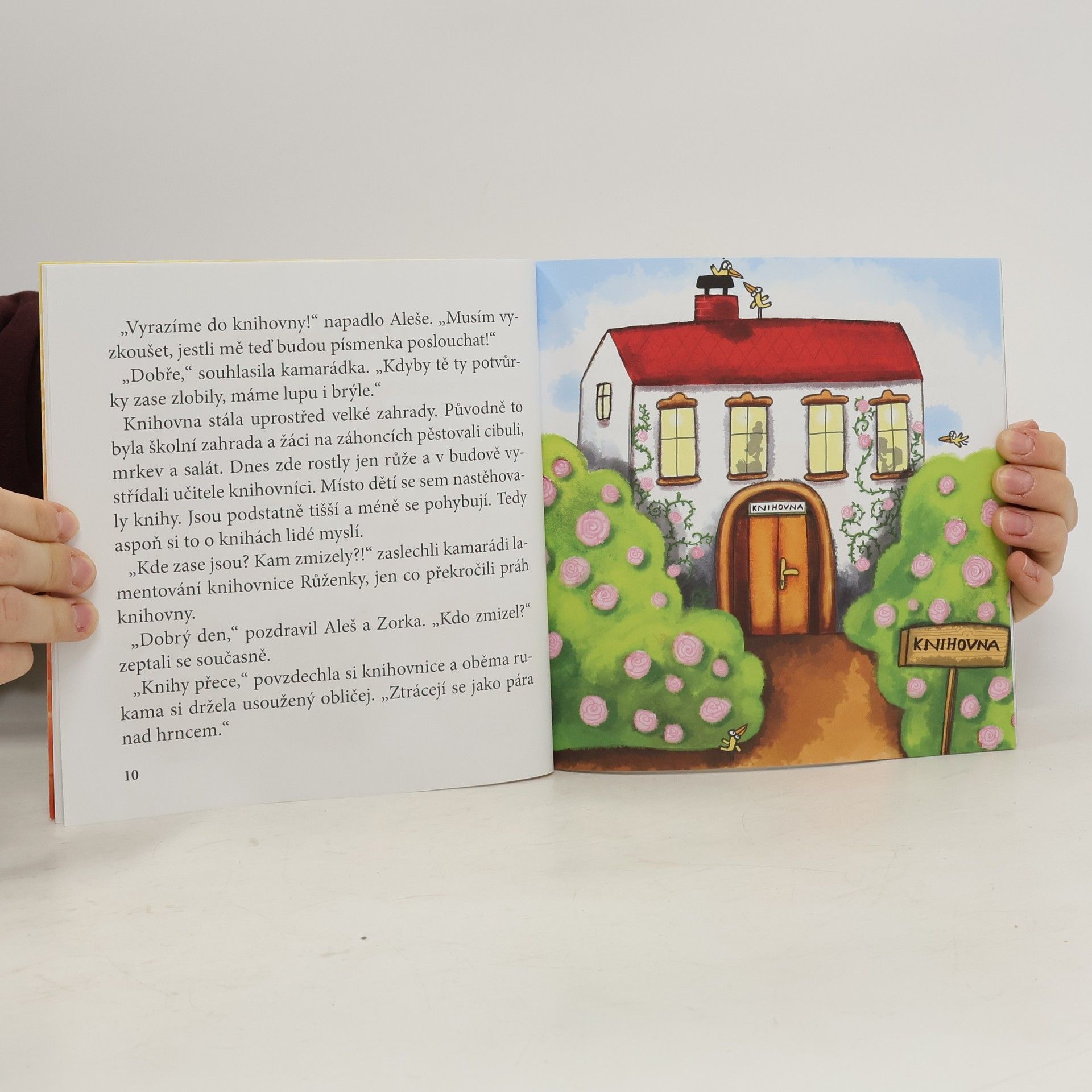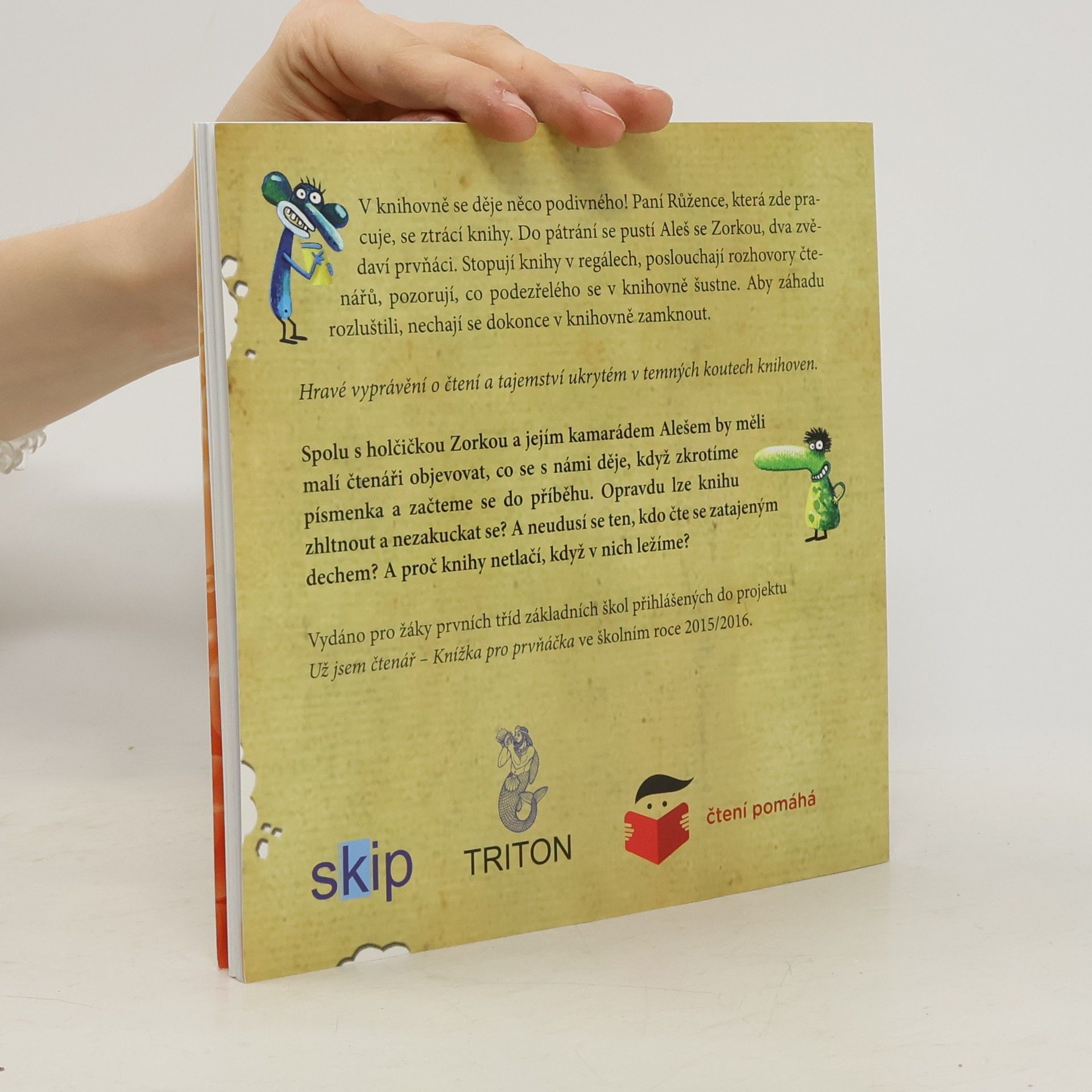 V knihovně se děje něco podivného! Paní Růžence, která zde pracuje, se ztrácí knihy. Do pátrání se pustí Aleš se Zorkou, dva zvědaví prvňáci. Stopují knihy v regálech, poslouchají rozhovory čtenářů, pozorují, co podezřelého se v knihovně šustne. Aby záhadu rozluštili, nechají se dokonce v knihovně zamknout. Hravé vyprávění o čtení a tajemství ukrytém v temných koutech knihoven. Spolu s holčičkou Zorkou a jejím kamarádem Alešem by měli malí čtenáři objevovat, co se s námi děje, když zkrotíme písmenka a začteme se do příběhu. Opravdu lze knihu zhltnout a nezakuckat se? A neudusí se ten, kdo čte se zatajeným dechem? A proč knihy netlačí, když v nich ležíme?