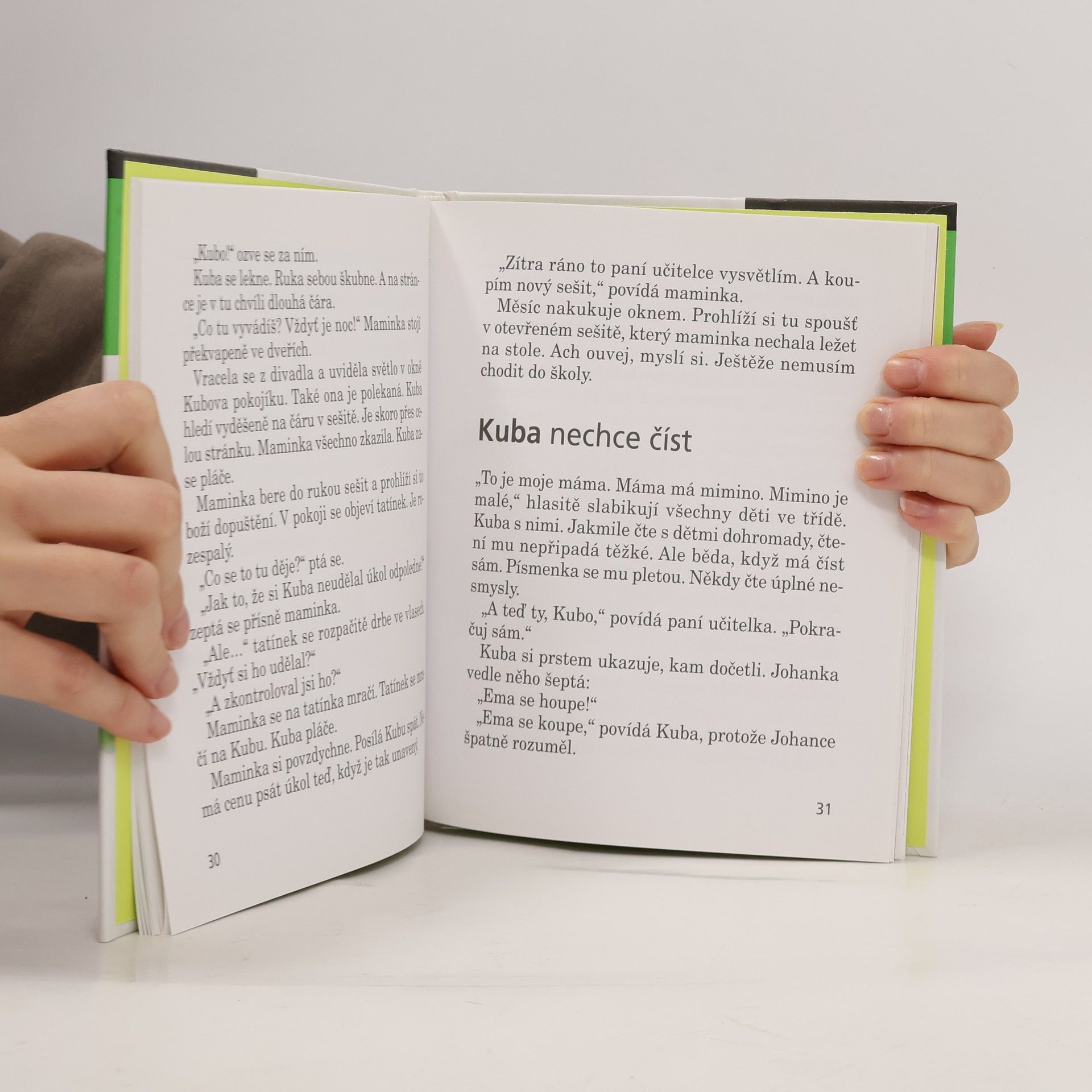 Kuba nechce číst, psát ani počítat. Do první třídy se mu vůbec nechtělo. Co si však počít s žáčkem, kterému se v hlavě honí všechno možné, jen ne škola? Paní učitelka z 1. A na to přišla! Od chvíle, kdy dostala ten skvělý nápad, začaly děti chodit do školy s nadšením. Dokonce i Kuba. A cože to paní učitelka báječného vymyslela? Dozvíte se v naší knížce! Humorné vyprávění o malém Kubovi je pro všechny prvňáčky, jimž škola zatím k srdci příliš nepřirostla. Mohou tak s Kubíkem sdílet jeho neúspěchy i první úspěchy, které sami velmi dobře znají. Mohou mu fandit a držet palce, aby ve svém úsilí vydržel. A především - naučí se s ním dobře číst!