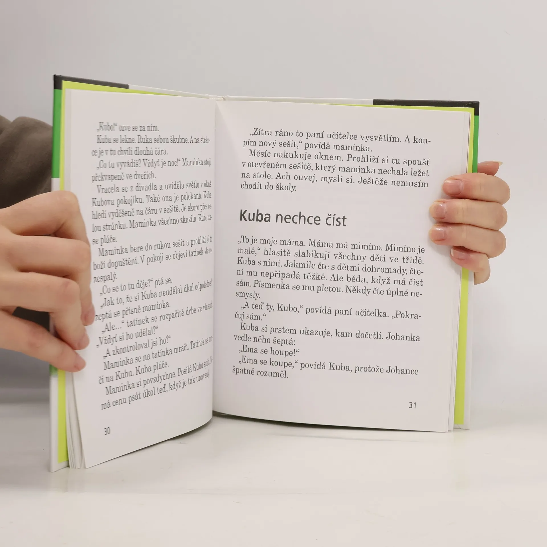 Kuba nechce číst, psát ani počítat. Do první třídy se mu vůbec nechtělo. Co si však počít s žáčkem, kterému se v hlavě honí všechno možné, jen ne škola? Paní učitelka z 1. A na to přišla! Od chvíle, kdy dostala ten skvělý nápad, začaly děti chodit do školy s nadšením. Dokonce i Kuba. A cože to paní učitelka báječného vymyslela? Dozvíte se v naší knížce! Humorné vyprávění o malém Kubovi je pro všechny prvňáčky, jimž škola zatím k srdci příliš nepřirostla. Mohou tak s Kubíkem sdílet jeho neúspěchy i první úspěchy, které sami velmi dobře znají. Mohou mu fandit a držet palce, aby ve svém úsilí vydržel. A především - naučí se s ním dobře číst!