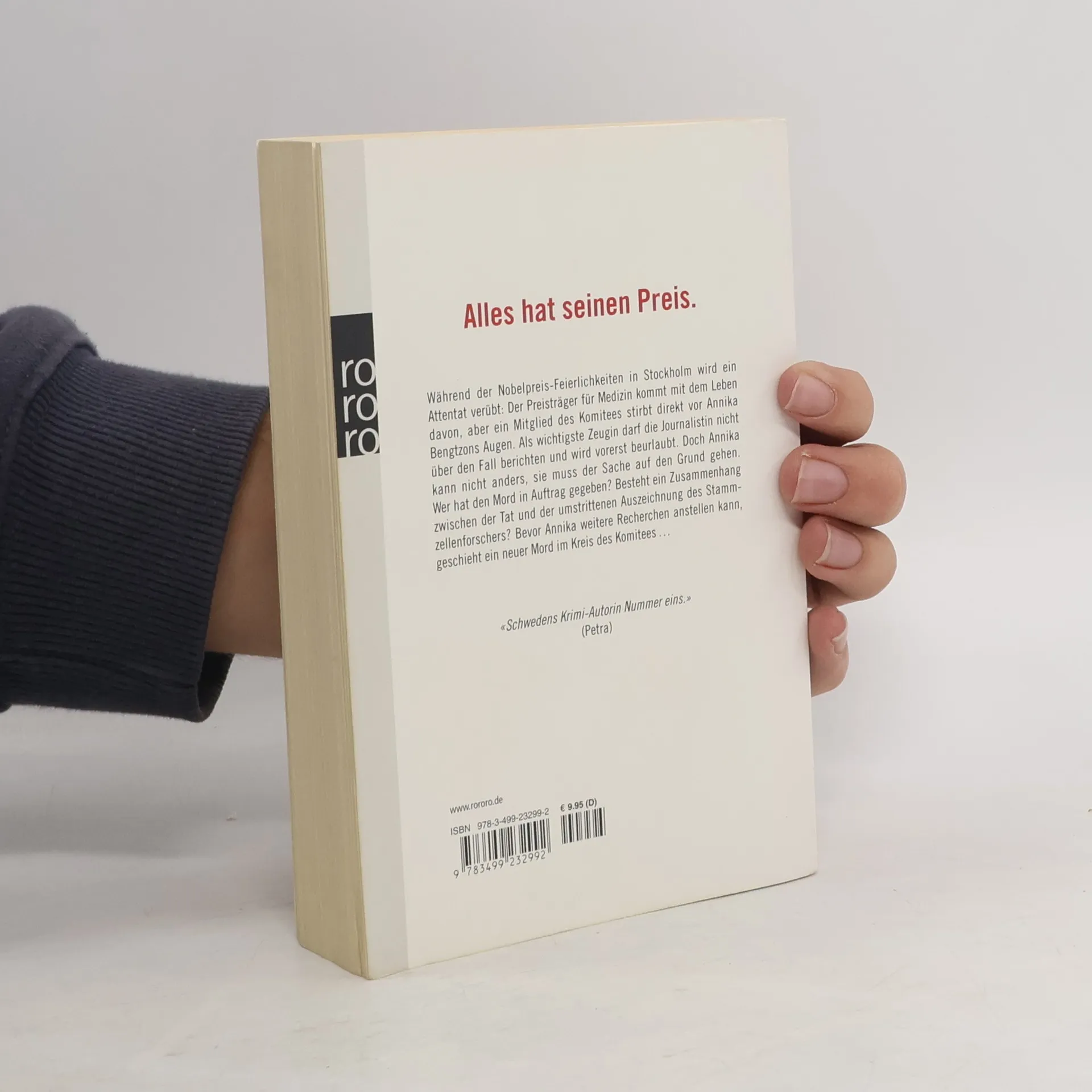 Alles hat seinen PreisWährend der Nobelpreis-Feierlichkeiten in Stockholm wird ein Attentat verübt: Der Preisträger für Medizin kommt mit dem Leben davon, aber ein Mitglied des Komitees stirbt direkt vor Annika Bengtzons Augen. Als wichtigste Zeugin darf die Journalistin nicht über den Fall berichten und wird vorerst beurlaubt. Doch Annika kann nicht anders, sie muss der Sache auf den Grund gehen. Wer hat den Mord in Auftrag gegeben? Besteht ein Zusammenhang zwischen der Tat und der umstrittenen Auszeichnung des Stammzellenforschers? Bevor Annika weitere Recherchen anstellen kann, geschieht ein neuer Mord im Kreis des Komitees…„Schwedens Krimi-Autorin Nummer eins.“ (Petra)
