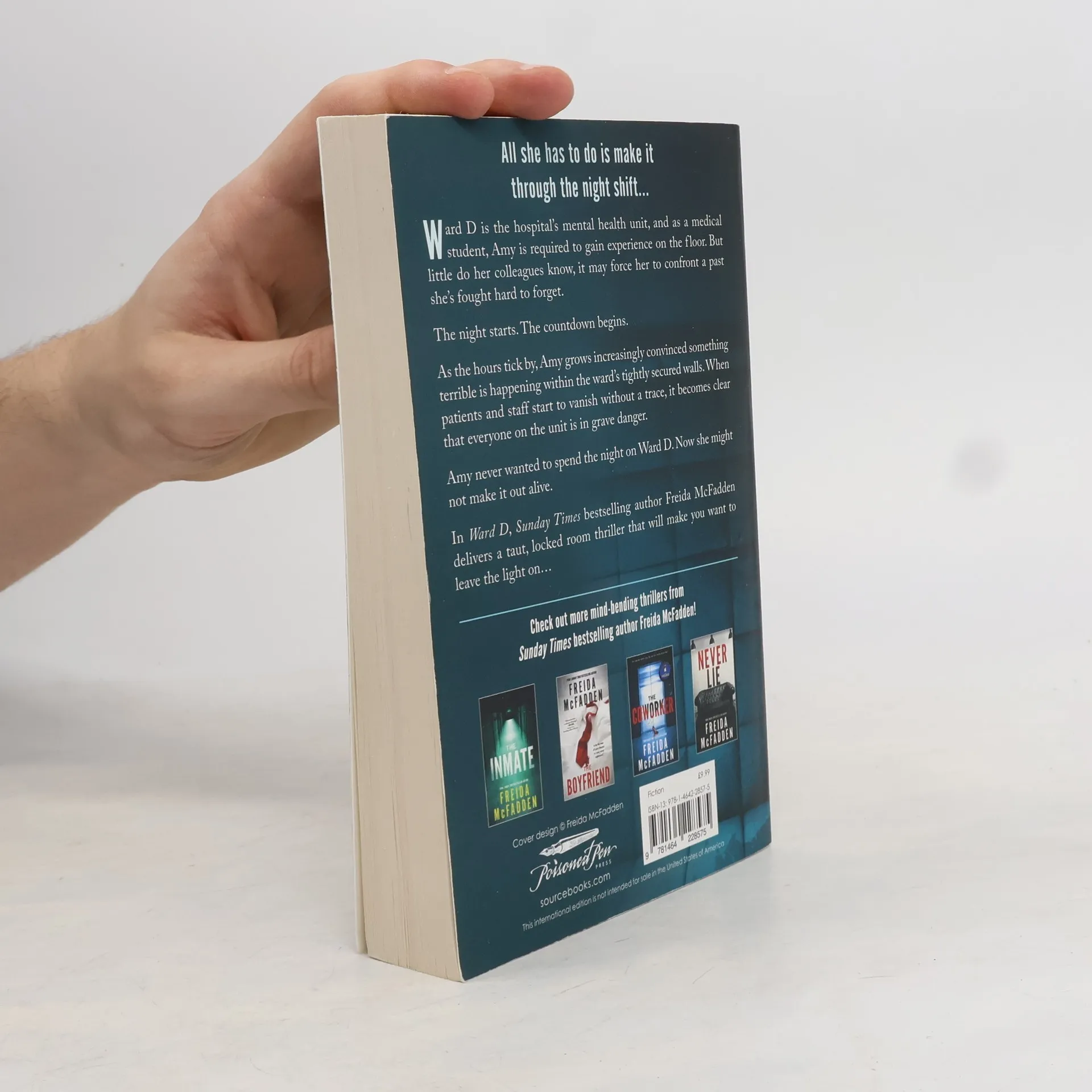 #1 Sunday Times bestselling author Freida McFadden returns with Ward D: a gripping locked room thriller set in an eerie hospital ward. *** Medical student Amy Brenner is spending the night on a locked psychiatric ward. All she has to do is make it through the night shift... Ward D is the hospital's mental health unit and as a medical student, Amy is required to gain experience on the floor. But little do her colleagues know it may force her to confront a past she's fought hard to forget. The night starts. The countdown begins. As the hours tick by, Amy grows increasingly convinced something terrible is happening within the ward's tightly secured walls. When patients and staff start to vanish without a trace, it becomes clear that everyone on the unit is in grave danger. Amy never wanted to spend the night on Ward D. Now, she might not make it out alive. Ward D once again demonstrates why Freida McFadden is the most talked-about voice in contemporary crime fiction, delivering a taut psychological thriller that will have you gripped right to the thrilling final twist. Tropes Claustrophobic Thriller Psychological Locked Room Mystery Thriller Suspense Thriller Survive the Night Also by Freida McFadden: The Crash The Boyfriend The Housemaid is Watching The Perfect Son The Coworker The Locker Door Never Lie The Teacher The Inmate One by One