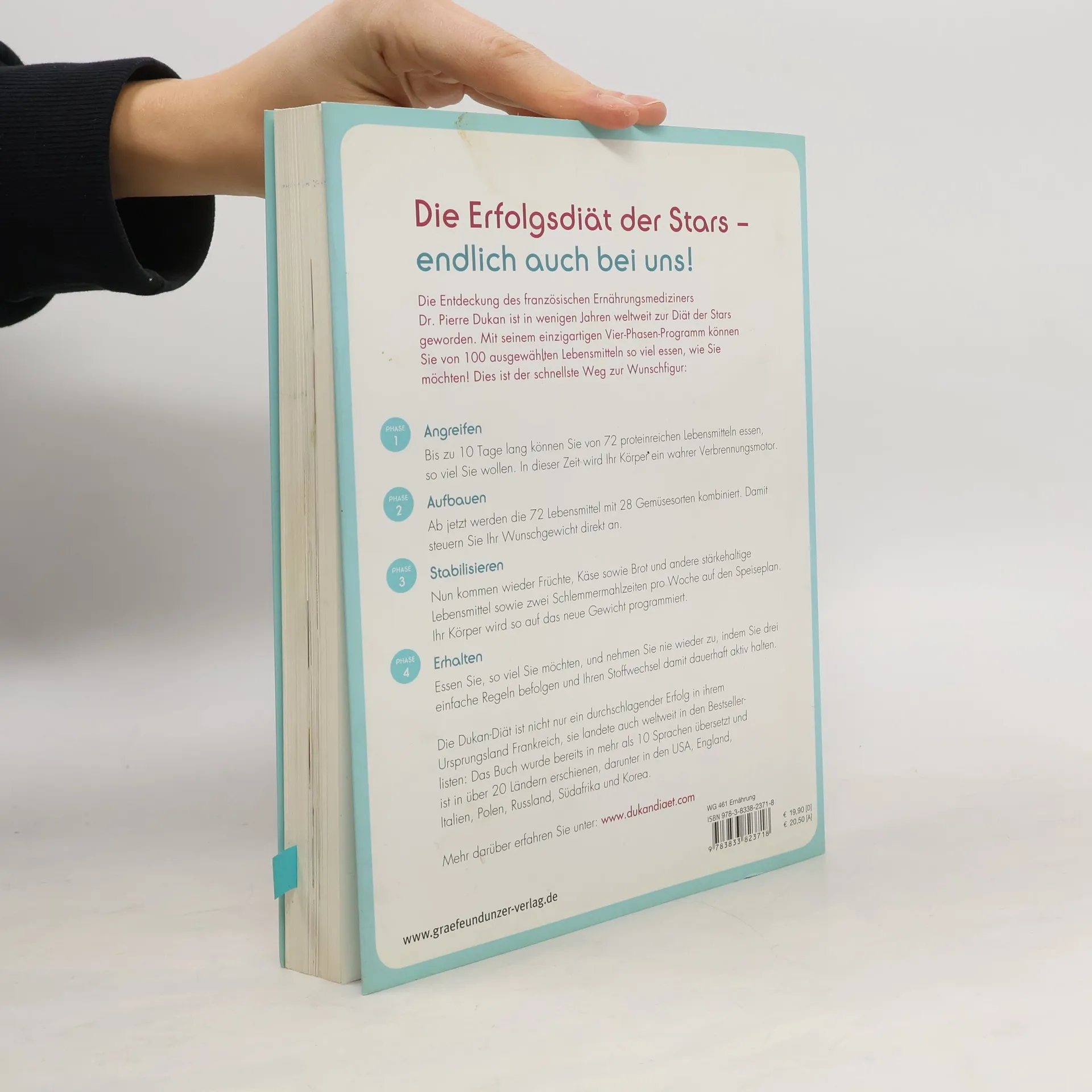 Der Bestseller aus Frankreich, England und den USA nun endlich auch bei uns! Dr. Dukans Diät besteht aus einem ausgeklügelten 4-Phasen-Programm: In der Angriffsphase werden nur eiweißlastige Nahrungsmittel wie Eier, Fisch und Fleisch verzehrt. Der Körper verliert so schnell an Kilos - ohne, dass Muskeln abgebaut werden. Die Aufbauphase erlaubt wieder Kohlenhydrate in Form von Gemüse. In der Stabilisierungsphase soll das erreichte Zielgewicht gehalten werden: Jetzt kehren Nudeln und Brot zurück - zwei Mahlzeiten pro Woche sind zum Schlemmen da. Danach beginnt die Erhaltungssphase: In Maßen ist alles wieder erlaubt. Nur ein Protein-Tag pro Woche verhindert, dass der Jo-Jo-Effekt auftritt. So ist eine dauerhafte Ernährungsumstellung gut durchzuhalten. Abgestimmt auf unsere Vorlieben und ausgestattet mit schmackhaften Rezepten wird dieses Konzept auch den Deutschen erfolgreich beim Abnehmen helfen!