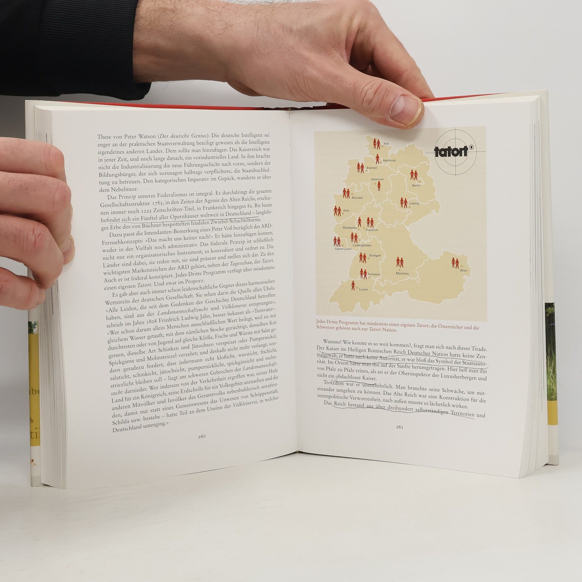 Zwei Autoren, die unterschiedlicher nicht sein könnten, erkunden liebevoll und kritisch die deutsche Seele. Sie beleuchten sie durch Begriffe wie „Abendbrot“, „Wanderlust“, „Männerchor“ und „Fahrvergnügen“ und schaffen in sechzig Kapiteln eine facettenreiche Kulturgeschichte. Die Diskussionen über Deutschland erreichen oft den gleichen Punkt: Darf man etwas als „deutsch“ bezeichnen? Können wir uns mit dem Deutschsein versöhnen? Thea Dorn und Richard Wagner glauben, dass es notwendig ist, das eigene Land wirklich kennenzulernen und machen eine Inventur der deutschen Seele. Ihr Werk ist eine erkenntnisreiche und unterhaltsame Reise zu den Wurzeln des nationalen Erbes. Obwohl es wie eine Enzyklopädie gelesen werden kann, sind die Texte nicht aus nüchterner Distanz verfasst. Sie bieten leidenschaftliche Plädoyers für bestimmte Merkmale des Deutschen und das damit verbundene Lebensgefühl. Diese „Liebeserklärung“ der Autoren ist ein sinnliches, reich bebildertes Werk, das die deutsche Seele anspricht, anstatt sie zu sezieren. Die Ausstattung umfasst durchgehend vierfarbige Seiten mit etwa 300 Abbildungen.