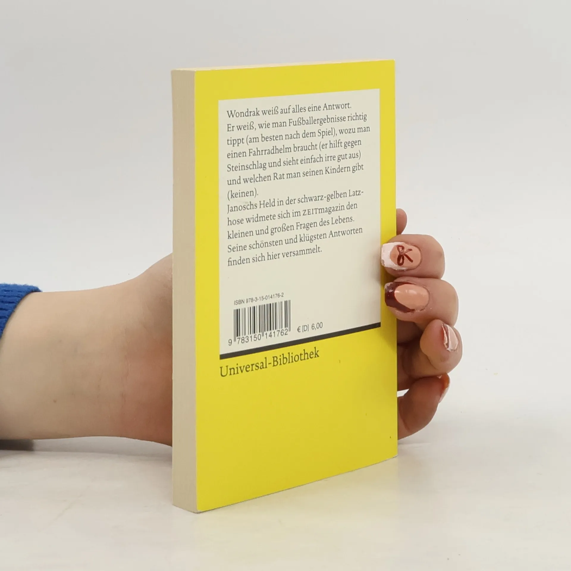 Wondrak weiß auf alles eine Antwort. Er weiß, wie man Fußballergebnisse richtig tippt (am besten NACH dem Spiel), wozu man einen Fahrradhelm braucht (er hilft gegen Steinschlag und sieht einfach irre gut aus) und welchen Rat man seinen Kindern gibt (keinen). Und er weiß, wie man unsterblich wird: Goethe wurde es durch das Schreiben, ein bisschen. Nun wird auch Wondrak ein bisschen unsterblich, denn die besten Zeichnungen seiner Kolumne für das ZEITmagazin erscheinen in Reclams Universal-Bibliothek. So wird der Held in der schwarz-gelben Latzhose wirklich zum Klassiker!