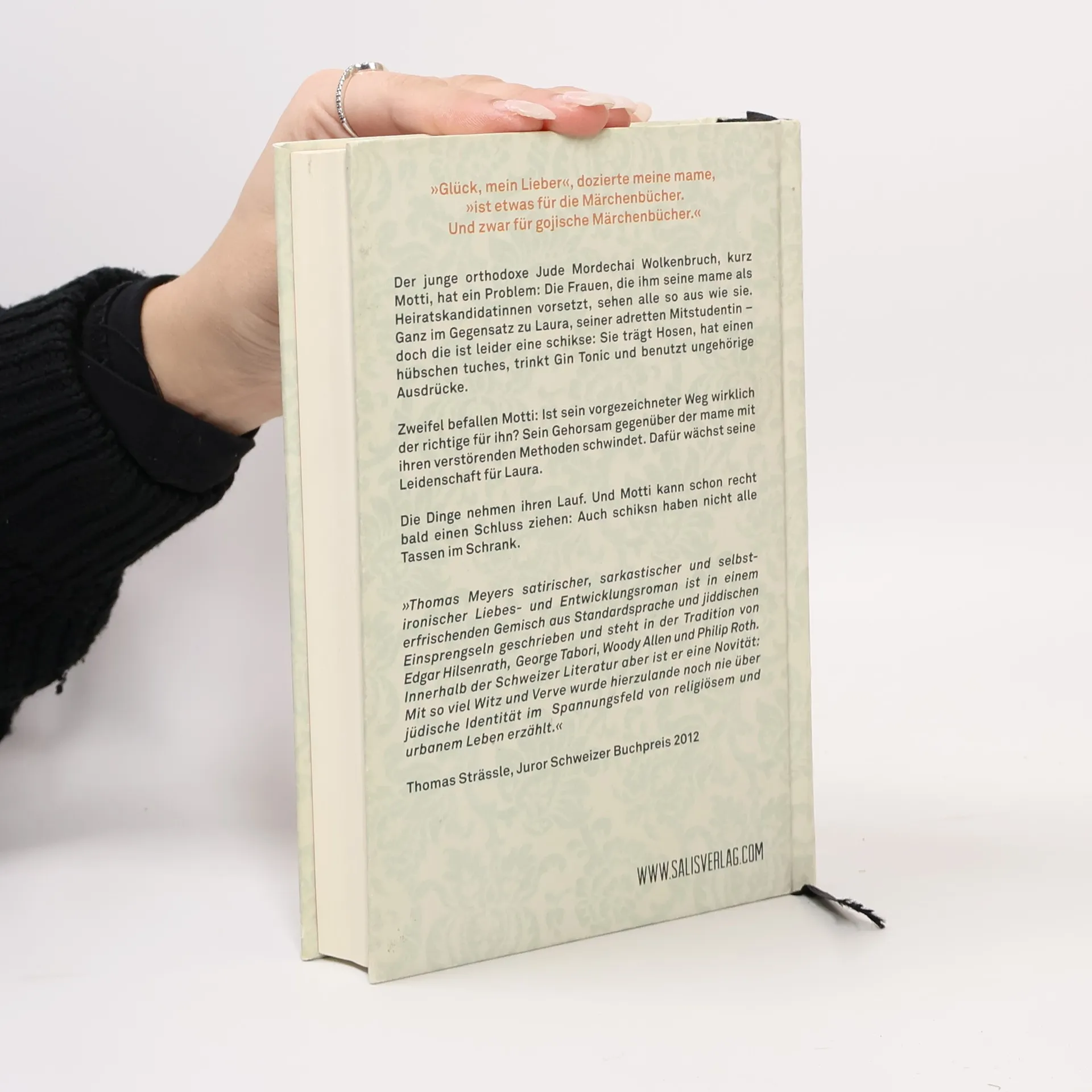 Motti Wolkenbruch lebt noch immer zu Hause, mit seiner geschwätzigen mame und seinem tate, der es seit längerem vorzieht zu schweigen und sich am liebsten hinter der aktuellen Ausgabe des „Tacheles“ versteckt. Die zufällige Begegnung mit einer hübschen Schickse wirft Mottis Leben aus der Bahn; ihm wird bewusst, dass er in seinen Kreisen kein Liebesglück finden wird. Und je mehr seine mame auf ihn einredet, umso stärker regt sich in ihm der Wunsch nach einem mamefreien Leben in den Armen ebendieser Schickse. Schritt für Schritt, manchen auch zurück, tritt Motti aus der orthodoxen Welt heraus in die säkulare, was auch grundlegende Veränderungen an seinem Äußeren mit sich bringt – der Bart kommt ab und die zu kurzen, schwarzen jüdischen Hosen machen modischen Jeans Platz. Mehr und mehr verwandelt sich Motti in einen typischen urbanen jungen Mann. Zwar ist er nun seine mame los, die ihn keines Blickes mehr würdigt, doch mehr Glück mit den Frauen hat er auch nicht. Jene, die er jetzt kennenlernt, haben wohl keinen dicken tuches, aber dafür nicht alle Tassen im Schrank. Thomas Meyers Roman führt auf unterhaltsame und kurzweilige Weise sozusagen vom orthodoxen A zum säkularen B, wobei sich an den Problemen mit den Frauen tendenziell bloß ändert, dass sie keine jüdischen Namen mehr tragen