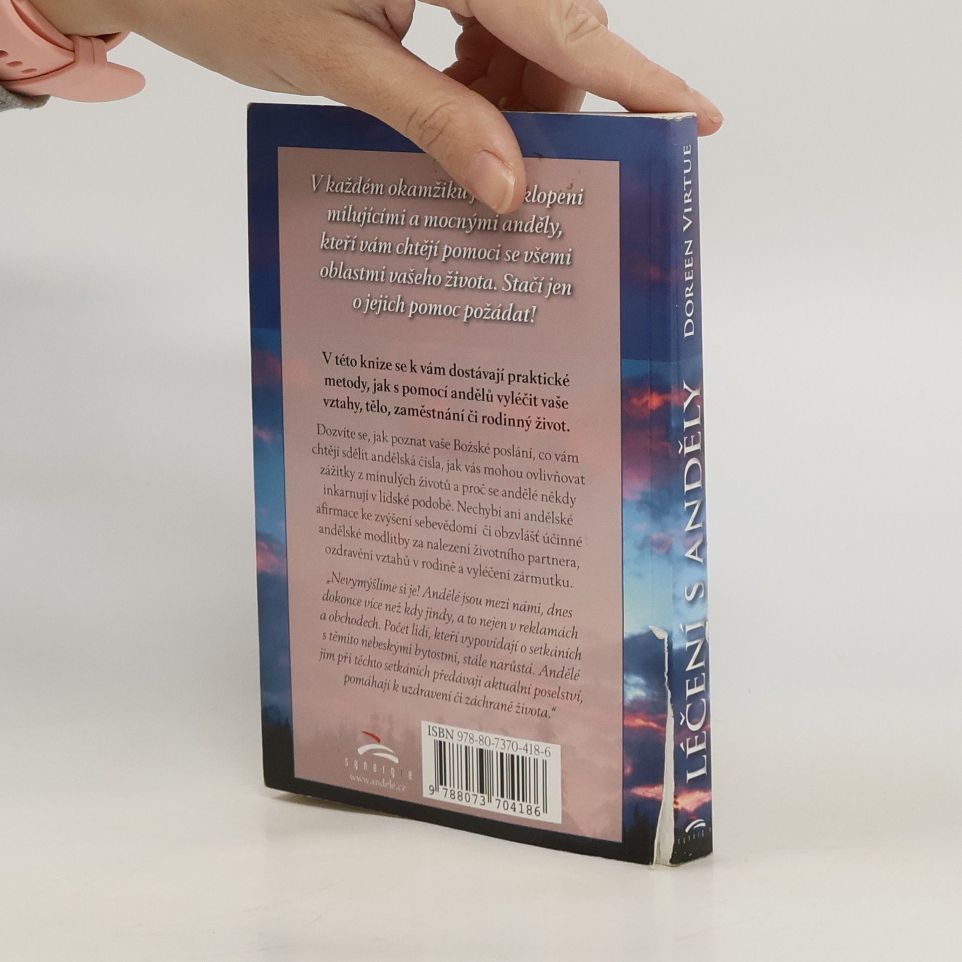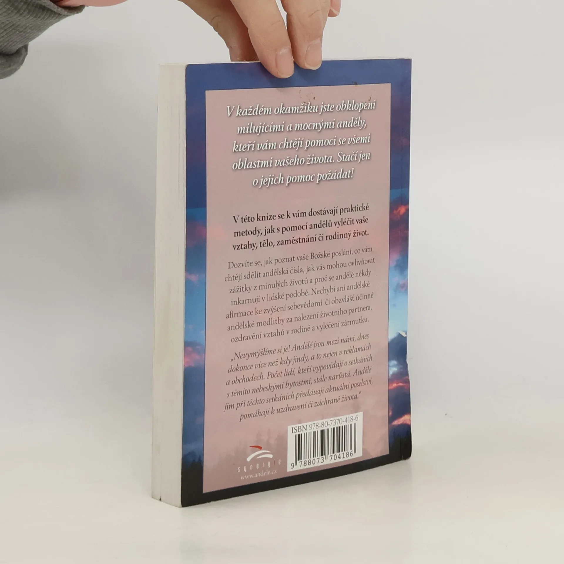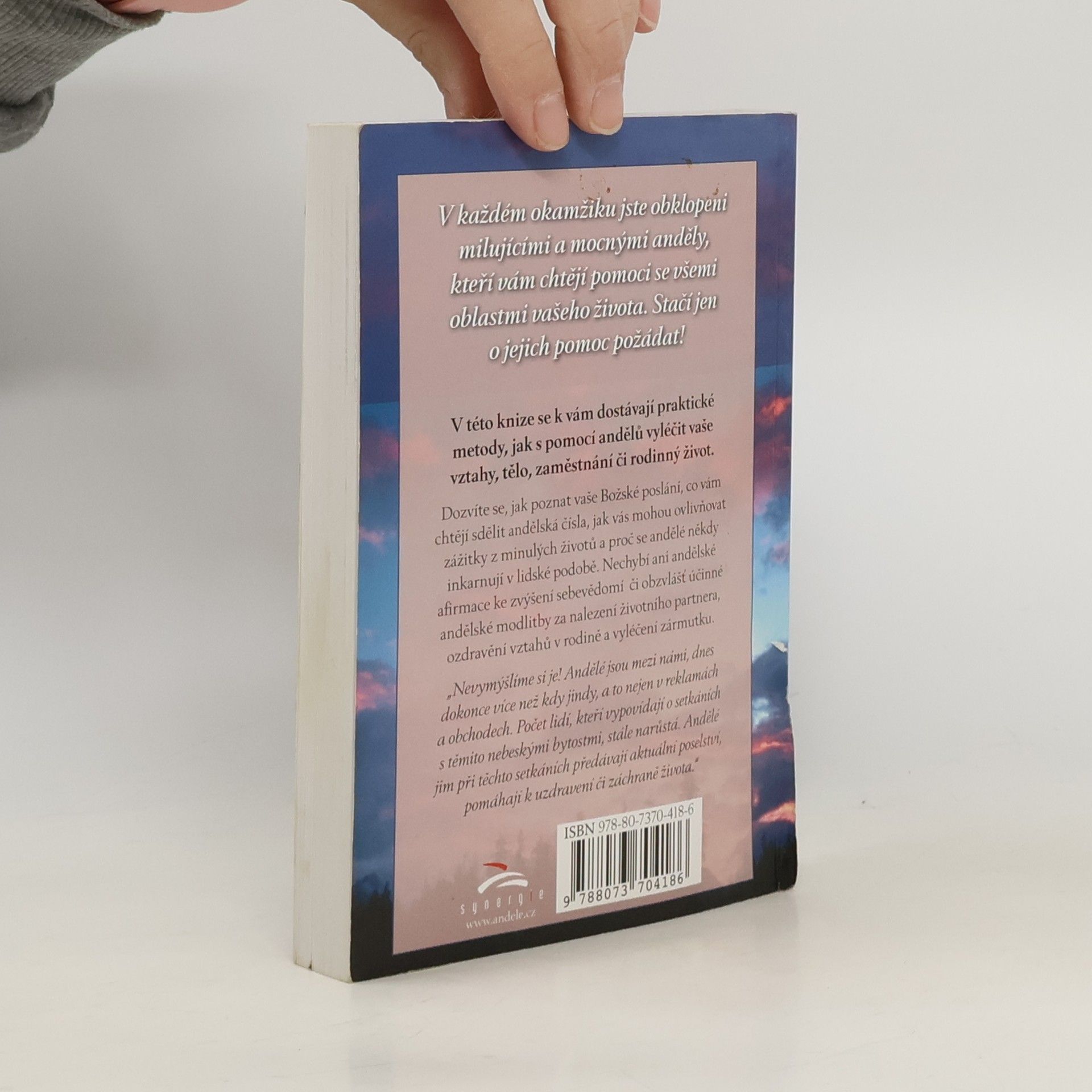 „Nevymýšlíme si je! Andělé jsou mezi námi, dnes dokonce více než kdy jindy, a to nejen v reklamách a obchodech. Počet lidí, kteří vypovídají o setkáních s těmito nebeskými bytostmi stále narůstá. Andělé jim v při těchto setkáních předávají aktuální poselství, pomáhají k uzdravení či záchraně života. Andělé jsou zde, aby nás učili, že Boží láska je odpovědí na všechny otázky a obtíže. Jsou zde, aby nás vyléčili z následků strachu. Jsou mocnými léčiteli a my s nimi můžeme spolupracovat a umocnit tak jejich snažení. Čím více budeme anděly zvát do svého života, tím jasněji se v našich životech odrazí velkolepost nebes. Léčivá moc andělů nemá hranic. Mohou nám pomoci vylepšit naše vztahy, zaměstnání, finanční záležitosti i bydlení a vyřešit jakékoli další problémy...“ NOVÉ BROŽOVANÉ VYDÁNÍ!