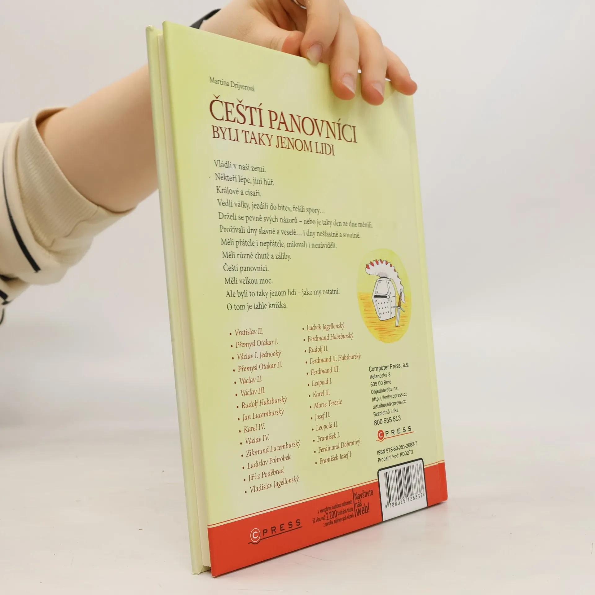 Vládli v naší zemi. Někteří lépe, jiní hůř. Králové a císaři. Vedli války, jezdili do bitev, řešili spory… Drželi se pevně svých názorů – nebo je taky den ze dne měnili. Prožívali dny slavné a veselé… i dny nešťastné a smutné. Měli přátele i nepřátele, milovali i nenáviděli. Měli různé chutě a záliby. Čeští panovníci. Měli velkou moc. Ale byli to taky jenom lidi – jako my ostatní. O tom je tahle knížka. Vratislav II. , Přemysl Otakar I., Václav I. Jednooký, Přemysl Otakar II., Václav II., Václav III., Rudolf Habsburský, Jan Lucemburský, Karel IV., Václav IV., Zikmund Lucemburský, Ladislav Pohrobek, Jiří z Poděbrad, Vladislav Jagellonský, Ludvík Jagellonský, Ferdinand Habsburský, Rudolf II., Ferdinand II. Habsburský, Ferdinand III., Leopold I., Karel II., Marie Terezie, Josef II., Leopold II., František I., Ferdinand Dobrotivý, František Josef I.