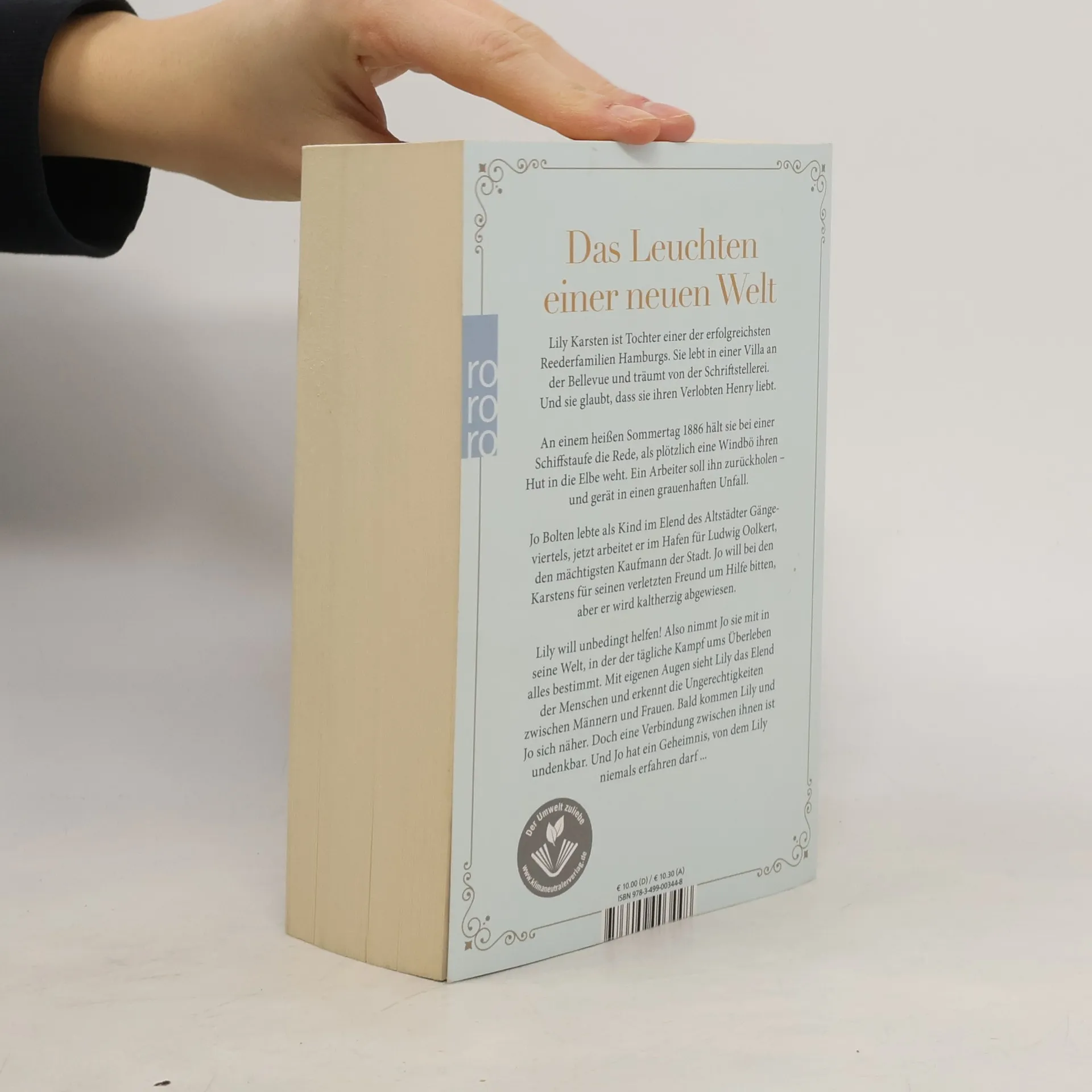 Das Leuchten einer neuen Welt Lily Karsten ist Tochter einer der erfolgreichsten Reederfamilien Hamburgs. Sie lebt in einer Villa an der Bellevue und träumt von der Schriftstellerei. Und sie glaubt, dass sie ihren Verlobten Henry liebt. An einem heißen Sommertag 1886 hält sie bei einer Schiffstaufe die Rede, als plötzlich eine Windbö ihren Hut in die Elbe weht. Ein Arbeiter soll ihn zurückholen – und gerät in einen grauenhaften Unfall. Jo Bolten lebte als Kind im Elend des Altstädter Gängeviertels, jetzt arbeitet er im Hafen für Ludwig Oolkert, den mächtigsten Kaufmann der Stadt. Jo will bei den Karstens für seinen verletzten Freund um Hilfe bitten, aber er wird kaltherzig abgewiesen. Lily will unbedingt helfen! Also nimmt Jo sie mit in seine Welt, in der der tägliche Kampf ums Überleben alles bestimmt. Mit eigenen Augen sieht Lily das Elend der Menschen und erkennt die Ungerechtigkeiten zwischen Männern und Frauen. Bald kommen Lily und Jo sich näher. Doch eine Verbindung zwischen ihnen ist undenkbar. Und Jo hat ein Geheimnis, von dem Lily niemals erfahren darf ...