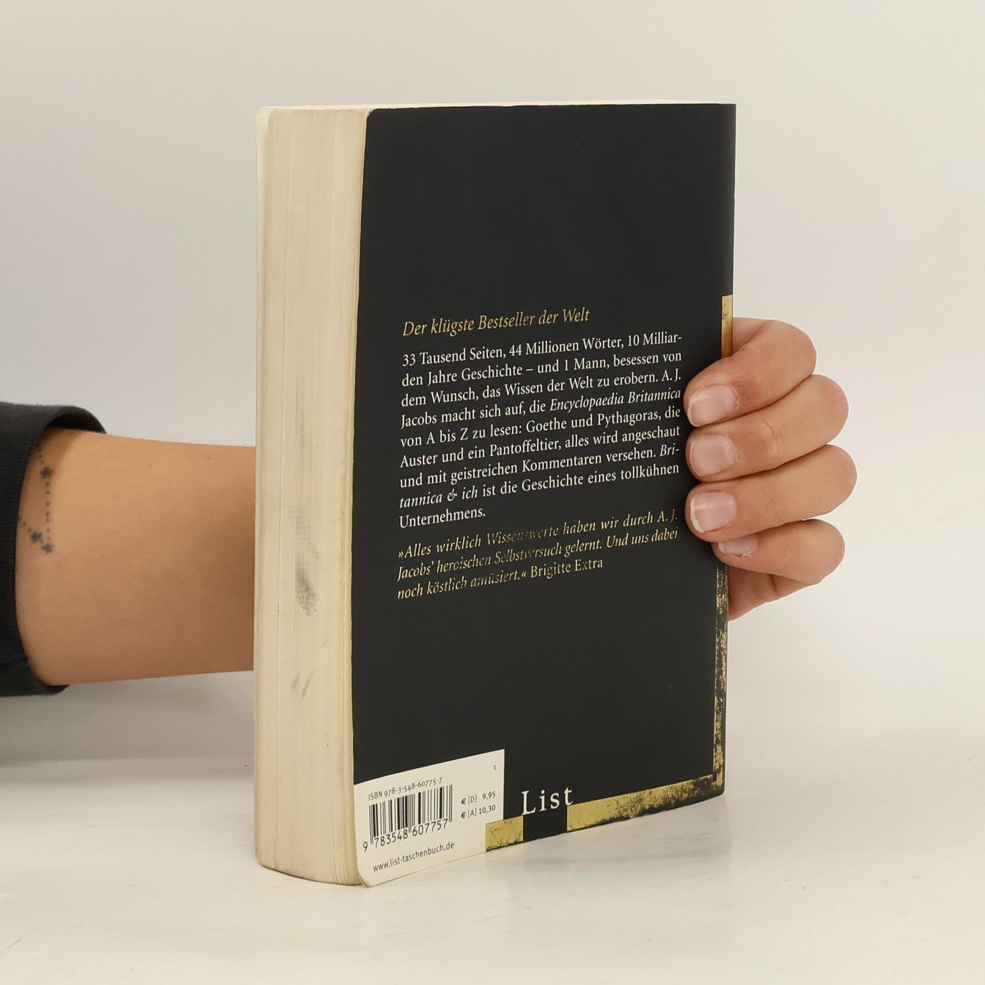 33 Tausend Seiten, 44 Millionen Wörter, 10 Milliarden Jahre Geschichte – und 1 Mann, besessen von dem Wunsch, das Wissen der Welt zu erobern. A. J. Jacobs macht sich auf, die Encyclopaedia Britannica von A bis Z zu lesen: Goethe und Pythagoras, die Auster und ein Pantoffeltier, alles wird angeschaut und mit geistreichen Kommentaren versehen. Britannica & ich ist die Geschichte eines tollkühnen Unternehmens.