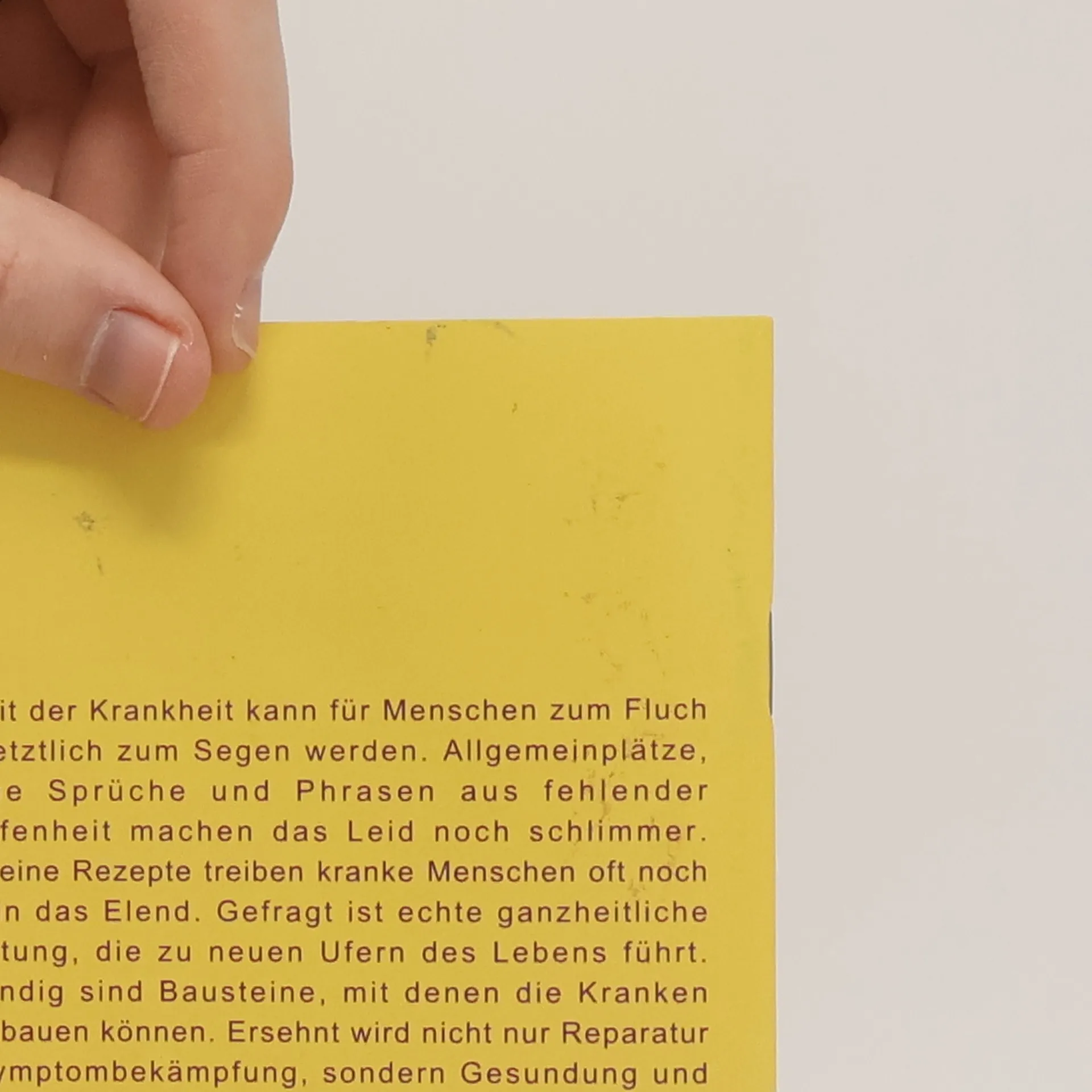 Die Zeit der Krankheit kann für Menschen zum Fluch oder letztlich zum Segen werden. Allgemeinplätze, fromme Sprüche und Phrasen aus fehlender Betroffenheit machen das Leid noch schlimmer. Allgemeine Rezepte treiben kranke Menschen oft noch tiefer in das Elend. Gefragt ist echte ganzheitliche Begleitung, die zu neuen Ufern des Lebens führt. Notwendig sind Bausteine, mit denen die Kranken selber bauen können. Ersehnt wird nicht nur Reparatur und Symptombekämpfung, sondern Gesundung und Heilung.