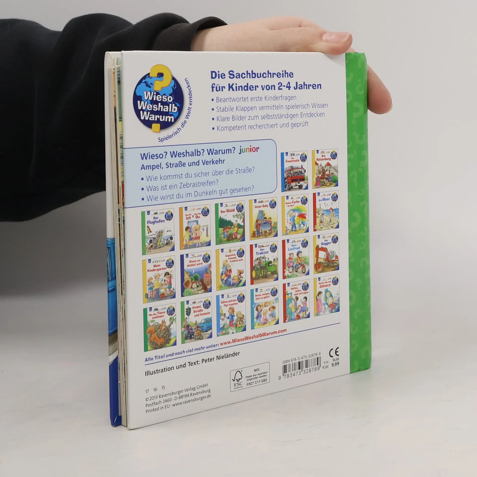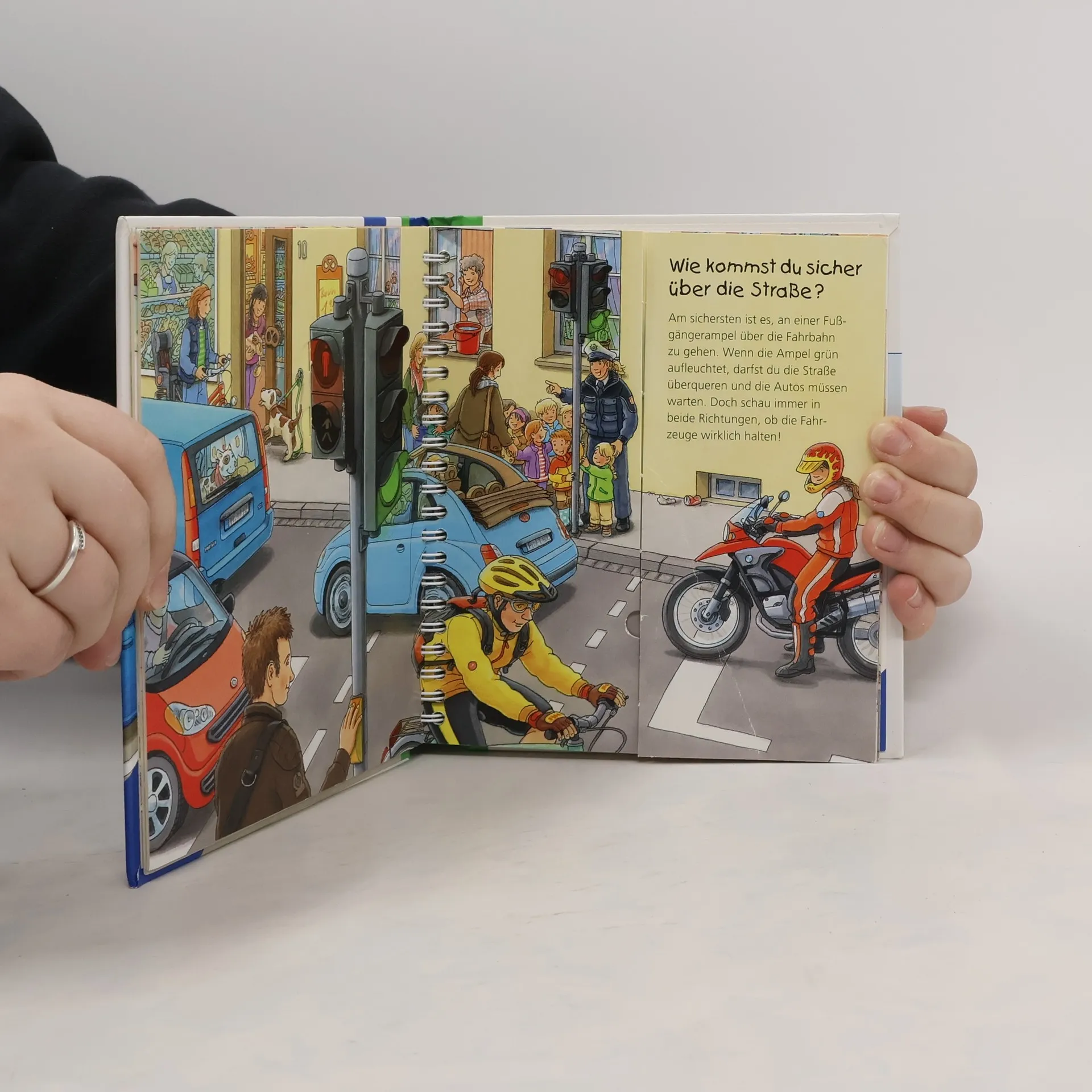 Wie überquert man eine Straße an einer Ampel oder einem Zebrastreifen? Wie wird man im Dunkeln gut gesehen? Kleine Kinder sind zwar noch nicht allein im Straßenverkehr unterwegs, trotzdem können sie in gefährliche Situationen geraten. Dieses Buch bringt ihnen anhand eindrücklicher Szenen und Bewegungsklappen die einfachsten Verhaltensregeln näher. Zum Abschluss können die Kinder in einem Richtig-Falsch-Quiz das Gelernte anwenden.