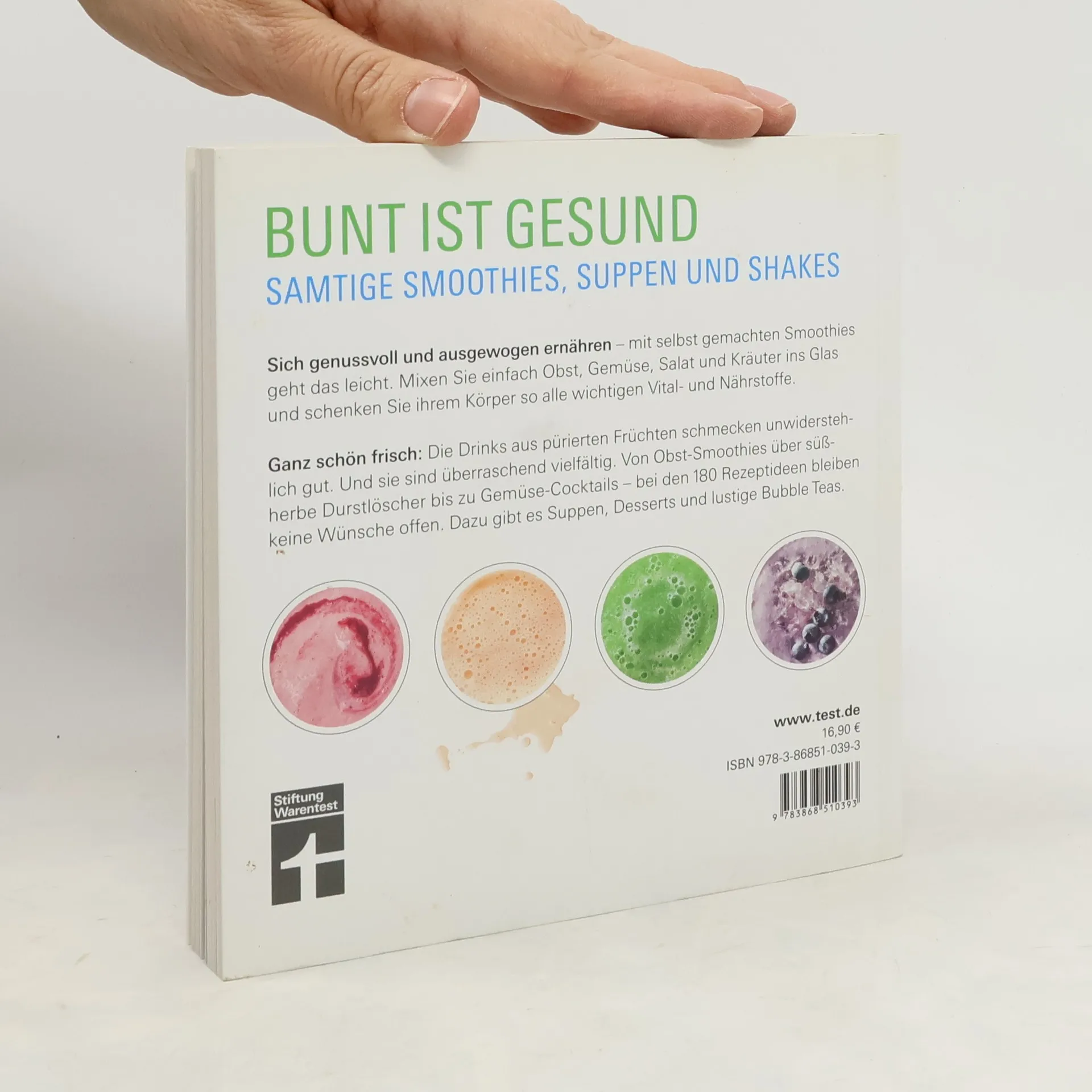 Smoothies sind selbstgemachte Drinks aus frischem Obst und Gemüse, die große Portionen an Vitalstoffen liefern. Und das Beste: Sie sehen nicht nur toll aus, sondern schmecken auch unwiderstehlich gut. Die 180 Rezepte überraschen mit süßen Vitaminquellen, erfrischenden Milchgetränken und gehaltvollen Gemüse-Cocktails aber auch ausgefallenen Obst-Smoothies, Bubble-Teas und kalten Suppen. Smoothies sind ideale Lieferanten von Vitaminen, Mineralstoffen und Ballaststoffen. Das neue Buch von Stiftung Warentest gibt Zubereitungstipps mit Schritt-für-Schritt-Fotos und Nährwertangaben und enthält eine ausführliche Warenkunde. Smoothies werden von der Deutschen Gesellschaft für Ernährung e. V. empfohlen. Nur selbstgemachte Smoothies sind wirklich gesund!